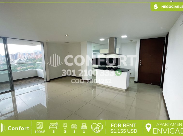 78-04-252 Inmobiliaria en Medellín arrienda apartamento ubicado en el sector de El Esmeraldal en Envigado, cuenta con un área de 100mts distribuidos en sala comedor, cocina integral en isla, balcón, zona de lavado, 3 habitaciones, una de ellas con vestier y baño privado, 2 baños sociales, sala de estudio, parqueadero y cuarto útil. Ubicado en urbanización con seguridad 24/7 con zonas de esparcimiento como piscinas, salón social, gimnasio, cancha de fútbol, skatepark y zona pet, a su alrededor podemos encontrar Smartfit y supermercados La Vaquita, con vías de acceso por la avenida El Poblado, transversal intermedia y gran variedad de rutas de transporte público. CONFORT GESTORES INMOBILIARIOS – Arriendo en Envigado