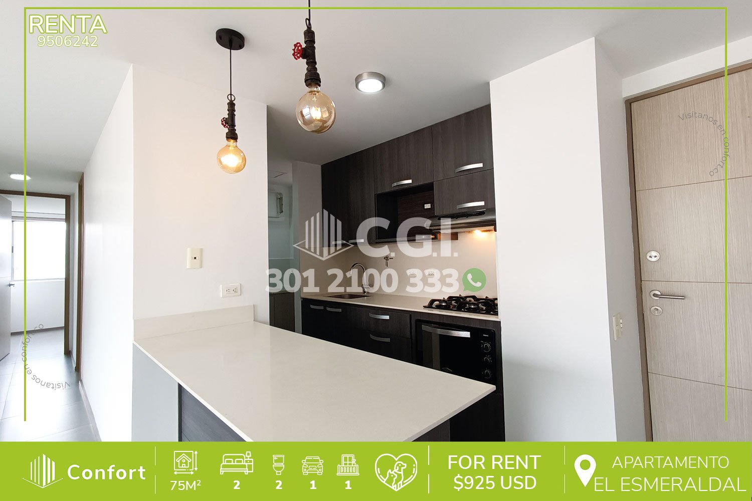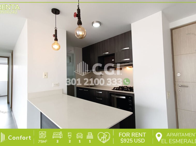 95-06-242 Hermoso y moderno apartamento disponible para la renta ubicado en excelente sector de El Esmeraldal en Envigado, cuenta con un área de 75mt2 distribuidos en sala comedor espaciosa e iluminada, cocina integral moderna con barra americana, zona de ropas, 2 habitaciones de excelente tamaño, la habitación principal cuenta con vestier y baño privado, adicional cuenta con baño social, closet de linos y amplio balcón tipo terraza con pérgola y hermosa vista, incluye parqueadero, seguridad 24/7 y zonas comunes como piscina, salón social, gimnasio, cancha de squash y zona BBQ. A su al rededor podemos encontrar Smartfit, Súper Bowling y mall Terracina, vías de acceso por Avenida El Poblado, Tranversal intermedia y gran variedad de transporte público. CONFORT GESTORES INMOBILIARIOS – Arriendo en Envigado