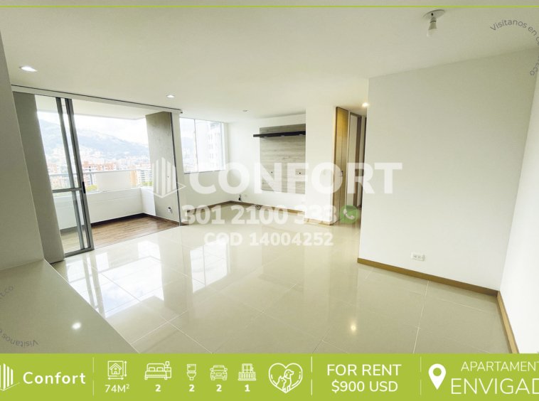 140-04-252 Inmobiliaria en Medellín arrienda apartamento ubicado en Envigado, sector La Loma del Esmeraldal. El inmueble tiene un área de 74 metros cuadrados, distribuidos en sala comedor, cocina, zona de lavado, dos habitaciones (la principal con vestier y baño privado), un baño social y un amplio balcón. Dispone de dos parqueaderos. El edificio ofrece vigilancia 24/7, ascensor y diversas zonas comunes que incluyen piscina para adultos y niños, zona de mascotas, zonas verdes, parque infantil, cancha de fútbol, salón social y pista de patinaje. En las cercanías se encuentran SmartFit, La Vaquita de la Intermedia, el estadio y salidas hacia la Loma del Esmeraldal y la Transversal Intermedia, con una amplia oferta de transporte público. CONFORT GESTORES INMOBILIARIOS – Apartamento en el Esmeraldal
