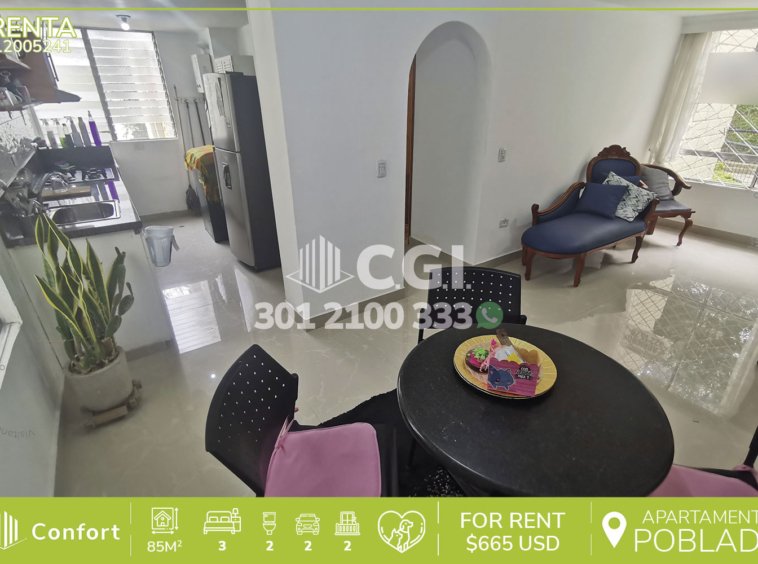 120-05-241 Inmobiliaria en Medellín arrienda hermoso apartamento ubicado en exclusivo sector de El Poblado, cuenta con 85mts2 distribuidos en, sala, comedor, cocina semi integral, 3 alcobas la principal con su respectivo baño privado, baño social, 2 balcones. La unidad residencial cuenta con portería 24/7, zona infantil y piscina, por su privilegiada ubicación está cerca a colegios, universidades, zonas comerciales, Mall El Indio y miradores, con fácil acceso por avenida Las Palmas, avenida El Poblado y Loma El Indio. CONFORT GESTORES INMOBILIARIOS – Arriendo en El Poblado