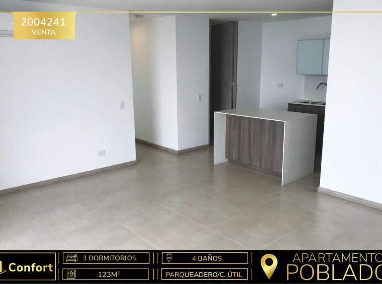 20-04-241 Hermoso y moderno apartamento disponible para la venta ubicado en el sector del Poblado. Cuenta con un área de 123mt2 distribuidos en sala comedor con aire acondicionado, cocina integral con full iluminación y los más hermosos acabados, balcón con vista panorámica, zona de ropas, sala de estudio, 3 habitaciones cada una de ellas con baño privado y la principal con vestier, además 2 parqueaderos y cuarto útil, se encuentra ubicado en unidad residencial con seguridad 24/7 y zonas comunes como piscinas para niños y adultos, gimnasio, salón social, parque infantil. A su alrededor podemos encontrar Parque Lleras, Provenza, Centro Comercial Vizcaya, y numerosos restaurantes, cafés, discotecas y más. Con rutas de acceso por avenida el Poblado, Calle 10 y gran variedad de transporte público. CONFORT INMOBILIARIA