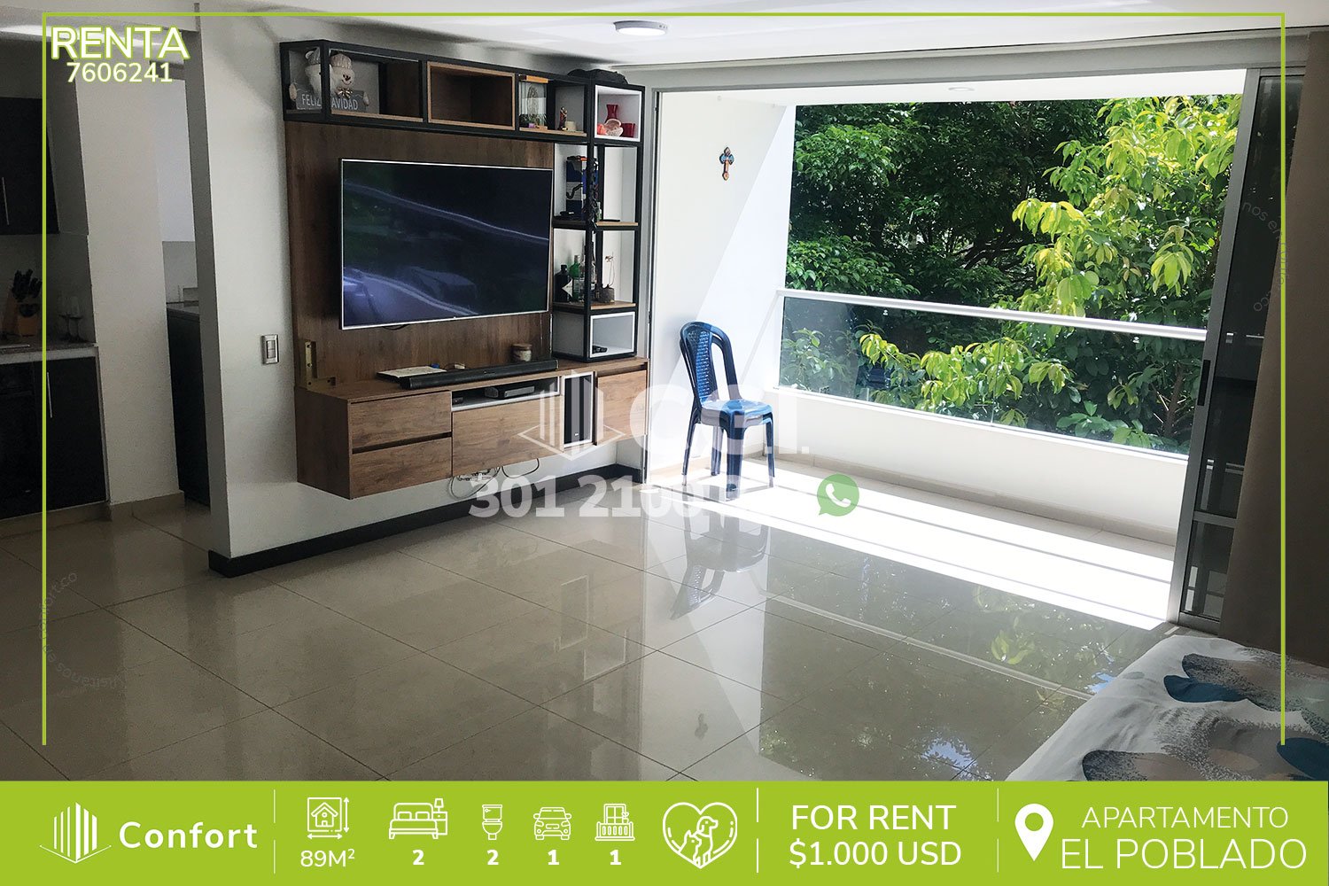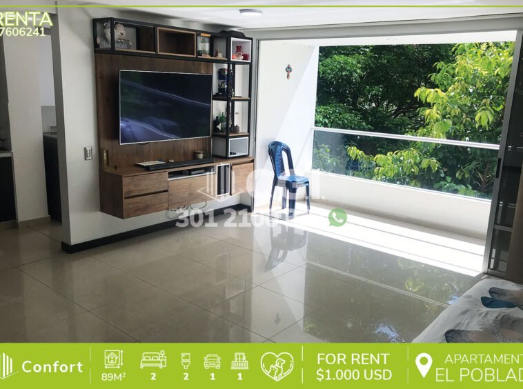 76-06-241 Moderno apartamento disponible para la renta ubicado en tranquilo sector de El Poblado, cuenta con 89mt2 distribuidos en sala comedor de muy buen espacio, cocina integral con barra americana y muy buena iluminación, balcón, 2 habitaciones, una de ellas con baño privado y vestier, closet, baño social, zona de ropas, parqueadero doble lineal y cuarto útil, con vigilancia 24/7 y zonas comunes como piscina para niños y adultos, zonas verdes, parque infantil y salón social. A su alrededor podemos encontrar el Centro Comercial Santafé, parque Los Balsos, mall La Visitación, rutas de acceso por Loma Los Balsos, transversal inferior y gran variedad de transporte público. CONFORT GESTORES INMOBILIARIOS – Arriendo en El Poblado