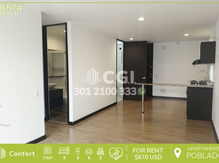 51-11-241 Inmobiliaria en Medellín arrienda apartamento ubicado en el sector de El Poblado – Medellín, cuenta con un área de 70mts distribuidos en sala comedor, cocina integral, 2 balcones, zona de ropas, 2 habitaciones , una de ellas con su baño privado y vestier, la otra con closet, baño social, parqueadero y cuarto útil. Ubicado en unidad cerrada que cuenta con seguridad privada 24/7 y zonas comunes tales como zona de mascota, zona infantil, gimnasio, salón social y zonas verdes, a su alrededor podemos encontrar Provenza y parque El Poblado, con vías de acceso por transversal superior, avenida El Poblado y gran variedad de rutas de transporte público. CONFORT GESTORES INMOBILIARIOS – Arriendo en El Poblado