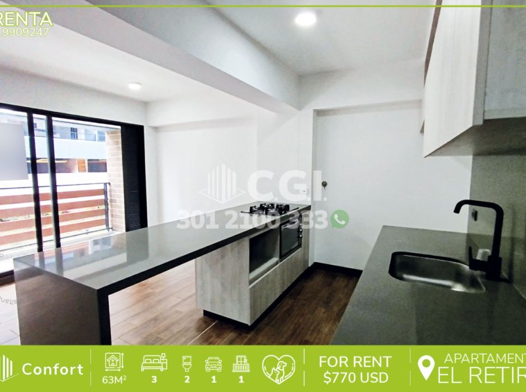 199-09-247 Inmobiliaria en Medellín arrienda apartamento en EL Retiro, Antioquia., con un área de 63mtrs2 distribuidos en sala comedor, cocina semi integral, zona de ropas, balcón, baño social, 3 habitaciones, una de ellas con baño privado y vestier, 2 closet, parqueadero y cuarto útil. Ubicado en unidad cerrada con seguridad privada 24/7 y ascensor, a sus alrededores podemos encontrar Puro Cuero y vías de acceso como Medellín – El Retiro y Rionegro – El Retiro, además, cuenta con gran variedad de rutas de transporte público. CONFORT GESTORES INMOBILIARIOS – Arriendo en El Retiro