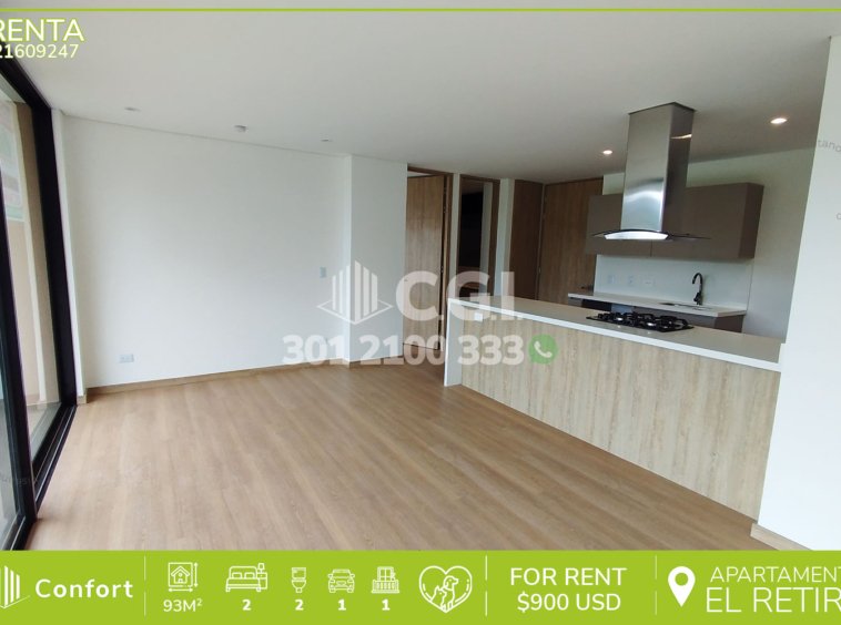 216-09-247 Inmobiliaria en Medellín arrienda apartamento en El Retiro, Antioquia., con un área de 93mtrs2, distribuidos en sala comedor, cocina semi integral, zona de ropas con calentador de agua, baño social, 2 habitaciones, una de ellas con baño privado y vestier, closet, balcón y parqueadero y cuarto útil. Ubicado en unidad cerrada con seguridad privada 24/7 y ascensor, a sus alrededores podemos encontrar Puro Cuero y vías de acceso como Medellín – El Retiro y Rionegro – El Retiro, además, cuenta con gran variedad de rutas de transporte público. CONFORT GESTORES INMOBILIARIOS – Arriendo en El Retiro