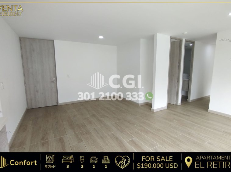 218-10-247 Apartamento disponible para la venta en El Retiro – Antioquia, cuenta con un área de 92 m2 distribuidos en sala comedor, cocina integral, balcón amplio, zona de ropas con calentador, 3 habitaciones amplias, una de ellas con baño privado y vestier, las otras dos con clóset, 2 baños sociales, salón social, gimnasio, zona de estar con billar, parqueadero, vigilancia 24/7, ubicado cerca al Mall Macedonia., con vías de acceso como Medellín – El Retiro, Rionegro – El Retiro y amplia variedad de rutas de transporte público. CONFORT GESTORES INMOBILIARIOS – Arriendo en El Retiro.