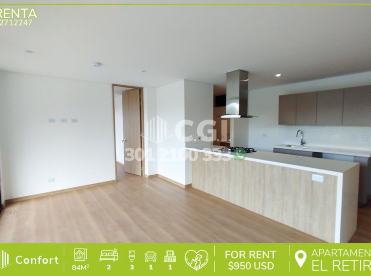 27-12-247 Apartamento disponible para la renta en El Retiro, Antioquia., cuenta con un área de 84 mts2 distribuidos en sala comedor amplia, balcón con hermosa vista, cocina integral, zona de ropas, baño social, 2 habitaciones con baño privado, una de ellas clóset y la otra con vestier, además, cuenta con parqueadero cubierto, zonas verdes y espacios sociales que se entregarán para el próximo año. Ubicado en unidad cerrada con seguridad privada 24/7, donde a su alrededor podemos encontrar el Mall Macedonia, vías de acceso como Medellín – El Retiro, Rionegro – El Retiro y amplia variedad de rutas de transporte público. CONFORT GESTORES INMOBILIARIOS – Arriendo en El Retiro