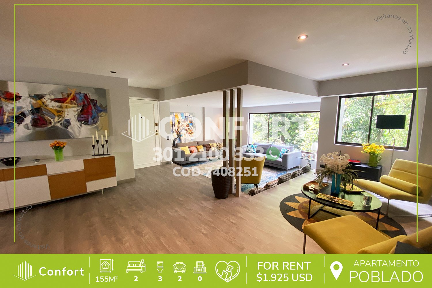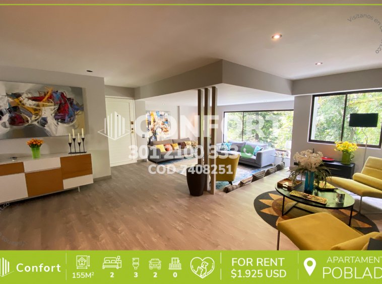 74-08-251 Inmobiliaria en Medellín arrienda apartamento ubicado en el sector de El Tesoro en El Poblado, cuenta con un área de 155mt2 distribuidos en sala, comedor, cocina semi integral, zona de ropas, 2 habitaciones con baño privado, la habitación principal además cuenta con biblioteca, habitación de servicio, baño social, 2 parqueaderos y cuarto útil. Ubicado en edificio con seguridad privada 24/7 y zonas comunes como piscina, salón social y zonas verdes, a su alrededor podemos encontrar el Mall Piaza Bella, Euro de La Inferior y el Mall Plaza, con vías de acceso por la transversal inferior, calle 4a y amplia variedad de rutas de transporte público. CONFORT GESTORES INMOBILIARIOS – Arriendo en El Poblado