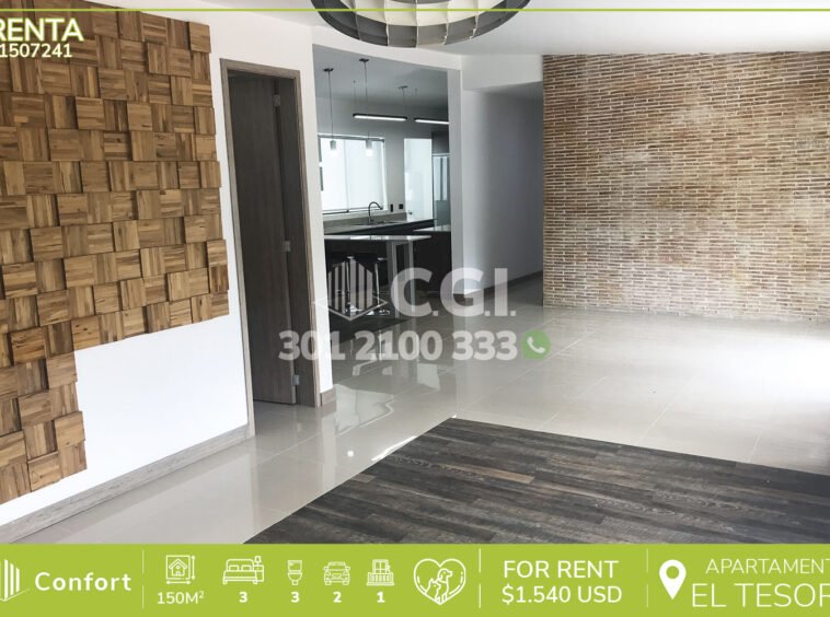 16-07-241 Hermoso y moderno apartamento disponible para la renta ubicado en tranquilo sector de El Tesoro en El Poblado, cuenta con 150mt2 distribuidos en sala muy iluminada, comedor, cocina integral con barra americana y hermosos acabados, zona de ropas, 3 habitaciones cada una con su respectivo clóset y una de ellas con baño privado, 2 baños sociales, un baño de servicio, 2 parqueaderos y cuarto útil, con vigilancia 24/7 y zonas comunes como piscina para niños y adultos, salón social y parque infantil. A su alrededor podemos encontrar el Centro Comercial El Tesoro, Del Este Centro Comercial, Uva El Tesoro, rutas de acceso por transversal inferior, carrera 29 y gran variedad de transporte público. CONFORT GESTORES INMOBILIARIOS – Arriendo en El Poblado