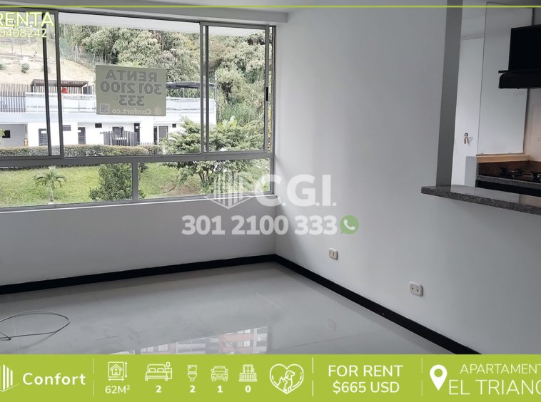 04-08-242 Inmobiliaria en Medellín arrienda apartamento en el sector de Envigado, El Trianón, cuenta con un área de 62mts2 distribuidos en cocina integral, sala comedor, 2 habitaciones cada una con vestier y la habitación principal además cuenta con baño privado, baño social, parqueadero y cuarto útil. Ubicado en unidad con seguridad privada 2477 y con zonas comunes tales como zonas verdes, piscina para adultos y niños, mirador, zona pet, salón social, gimnasio y juegos infantiles. A su alrededor podemos encontrar el Centro Comercial VIVA, Centro Comercial Mayorca y supermercados La Vaquita, con rutas de acceso por la avenida regional, avenida El Poblado y gran variedad de rutas de transporte. CONFORT GESTORES INMOBILIARIOS – Arriendo en Envigado