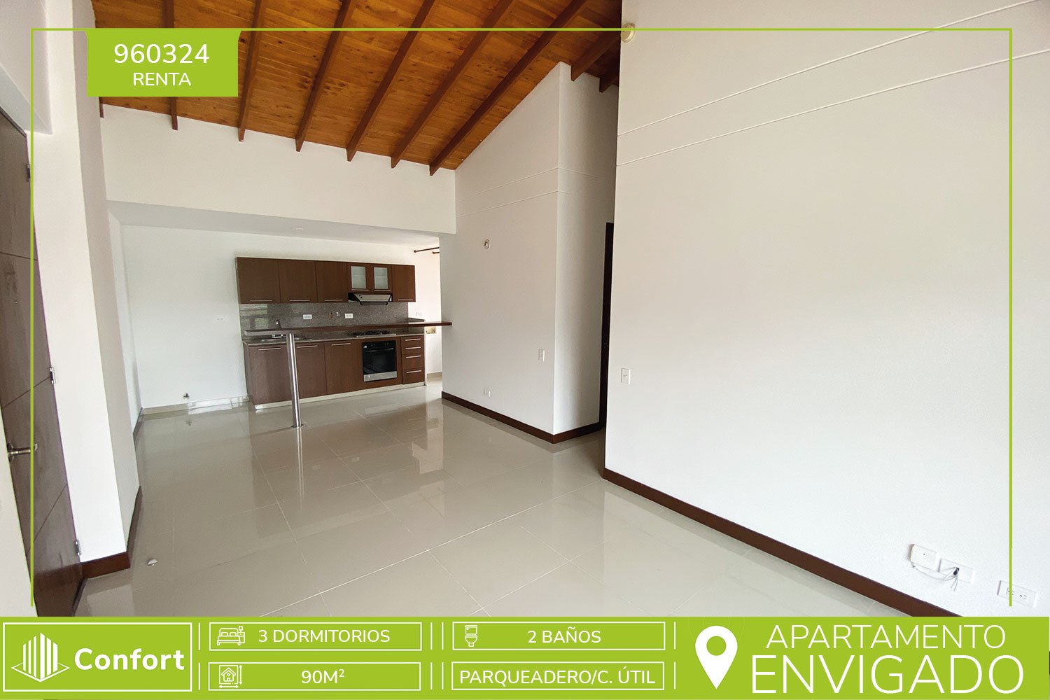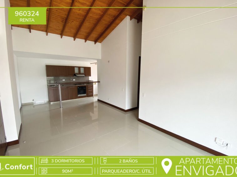 96-03-24 Apartamento disponible para la renta ubicado en el sector Cumbres de Envigado, cuenta con un área de 90 mt2 distribuidos en sala comedor muy espaciosa, cocina integral con full iluminación, barra americana y con muy buenos acabados, cuenta con balcón de buen espacio con excelente vista, 3 alcobas, la principal con baño y vestier privado, además de baño social, parqueadero y cuarto útil. Ubicado en unidad residencial con seguridad 24/7 y zonas comunes como salón social, parques para niños, gimnasio, piscina para adultos y niños, cancha de squash, cancha de futbol. A su alrededor podemos en encontrar el mall Guadalcanal, City Plaza Centro Comercial y mall Terracina Plaza. Con vías de acceso tanto por la avenida el Poblado como por la transversal Intermedia, además cuenta con variedad de transporte publico en la zona. CONFORT INMOBILIARIA