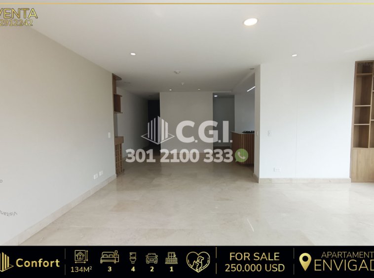 29-12-242 Inmobiliaria en Medellín vende apartamento ubicado en el sector de Zúñiga en Envigado, cuenta con un área de 134 mts2 distribuidos en sala comedor, cocina integral con lavavajillas , balcón, zona de ropas, 3 habitaciones, 2 de ellas con baño privado y vestier, la otra con closet, 2 baños sociales, zona de estudio, 2 parqueaderos y cuarto útil. Ubicado en edificio que cuenta con seguridad privada 24/7 y zonas comunes tales como gimnasio, salón social y turco, a su alrededor podemos encontrar supermercado EURO, mall La Frontera y Sao Paulo plaza, con vías de acceso por avenida El Poblado, avenida Las Vegas y gran variedad de rutas de transporte público. CONFORT GESTORES INMOBILIARIOS – Venta en Envigado