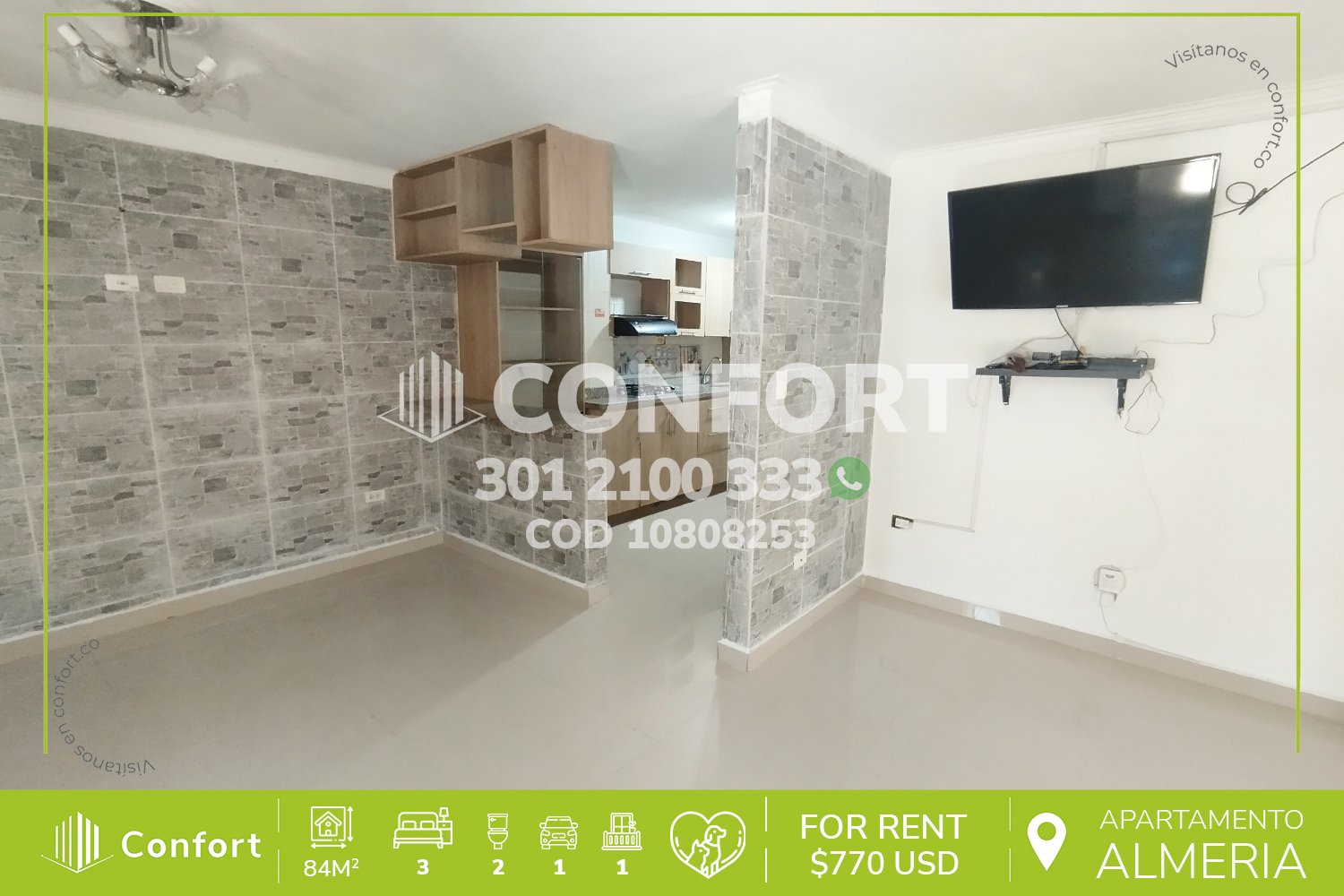 108-08-253 Inmobiliaria en Medellín arrienda apartamento ubicado en el sector de La Almería, cuenta con un área de 84mt2 distribuidos en sala comedor, cocina semi integral, balcón, 3 habitaciones con clóset, una de ellas con baño privado, baño social, patio con zona de ropas y parqueadero cubierto. A su alrededor podemos encontrar la Universidad Adventista, Éxito de Laureles, vías de acceso por las avenidas 35, 80 y gran variedad de transporte público. CONFORT GESTORES INMOBILIARIOS – Arriendo en Medellín