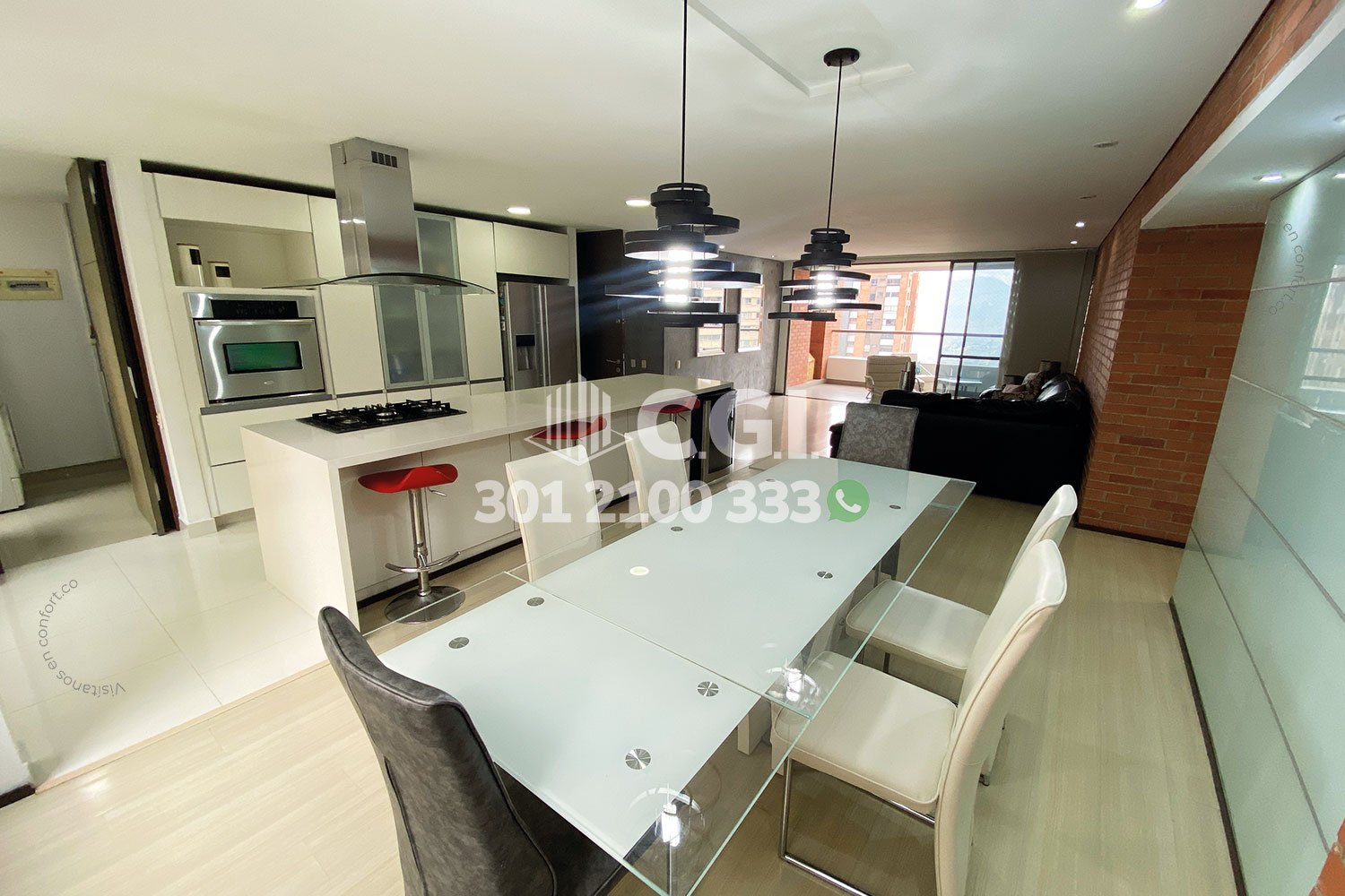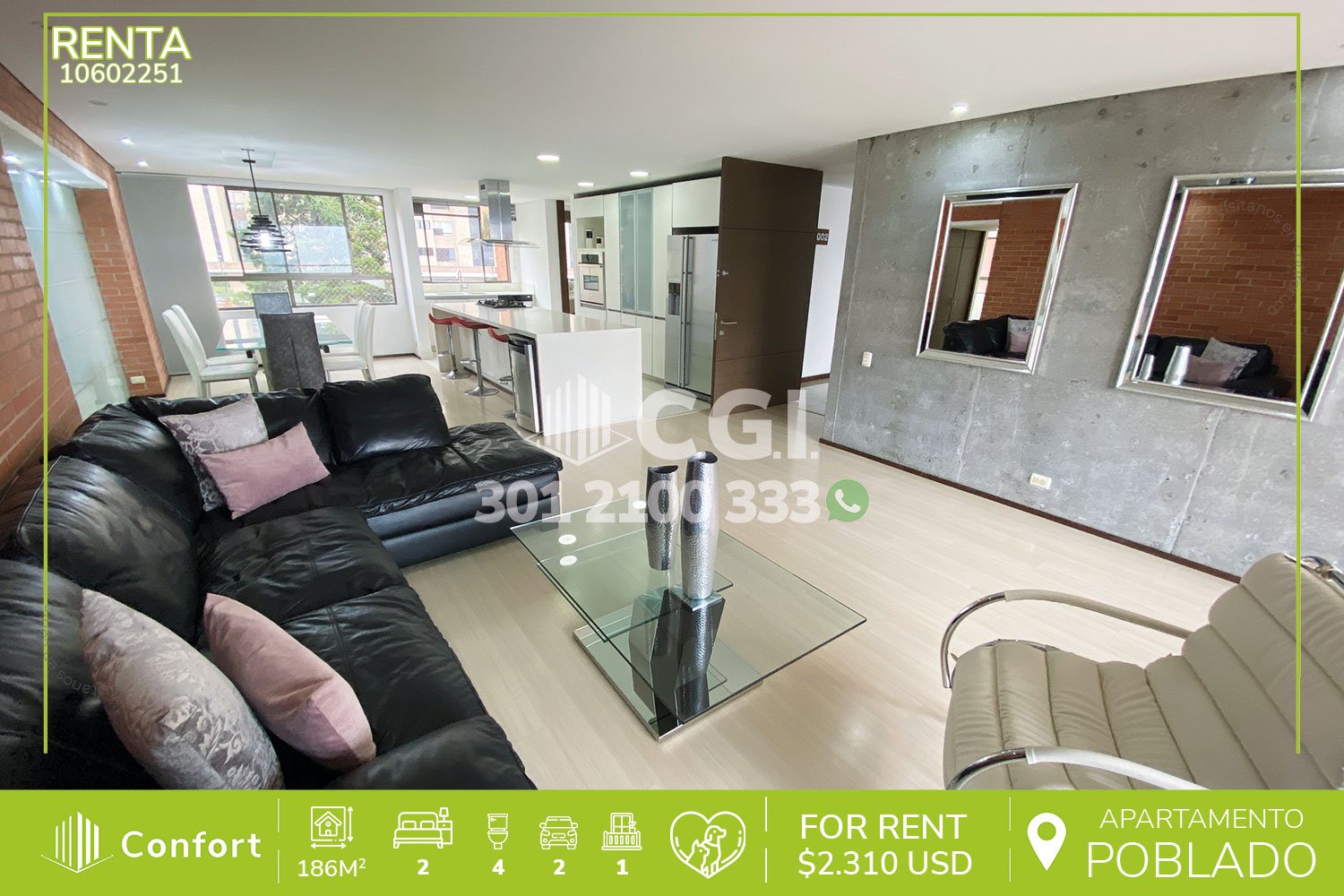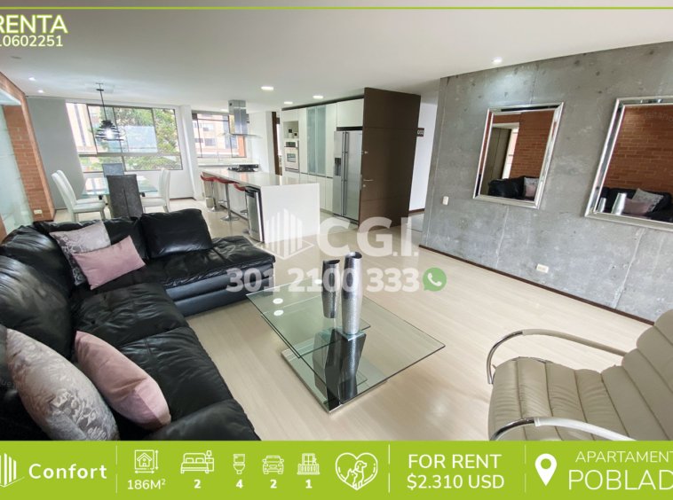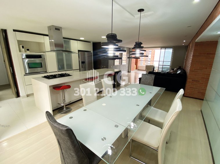 106-02-251 Inmobiliaria en Medellín arrienda apartamento ubicado en el sector de La Calera en El Poblado, cuenta con 186mt2 distribuidos en sala comedor de buen espacio, cocina integral en isla, zona de ropas, balcón con vista panorámica, 2 habitaciones cada una con su respectivo baño privado y vestier, 2 baños sociales, sala de star, habitación de servicio con su respectivo baño, 2 parqueaderos y cuarto útil. Ubicado en edificio con seguridad privada 24/7 y zonas comunes como piscina para niños y adultos, salón social, turco, gimnasio, parque infantil, cancha de fútbol y zonas verdes, a su alrededor podemos encontrar Mall del Este, centro comercial El Tesoro y Ámsterdam Plaza, con vías de acceso por la avenida El Poblado, transversal superior y gran variedad de transporte público. CONFORT GESTORES INMOBILIARIOS – Arriendo en El Poblado