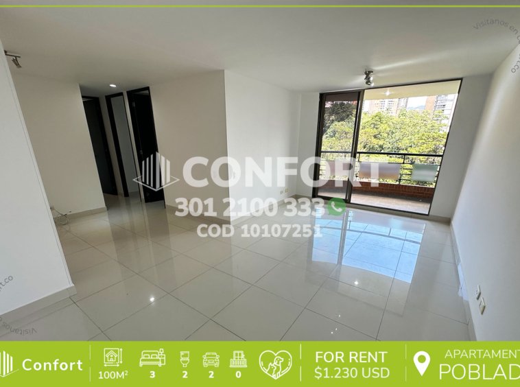101-07-251 Inmobiliaria en Medellín arrienda apartamento ubicado en el sector de la Cola del Zorro en El Poblado, cuenta con un área de 100mt2 distribuidos en sala comedor, cocina integral, zona de ropas, balcón, 3 habitaciones, una de ellas con baño privado y vestier, 2 con clóset, baño social, sala de estudio, parqueadero doble lineal y cuarto útil. Ubicado en unidad con seguridad privada 24/7 y zonas comunes tales como piscina para niños y adultos, salón social, gimnasio, zona infantil y zonas verdes, a su alrededor podemos encontrar Carulla, Universidad CES, colegio Marymount y el museo Pablo Escobar, con vías de acceso por la avenida El Poblado, transversal superior y gran variedad de transporte público. CONFORT GESTORES INMOBILIARIOS – Arriendo en El Poblado