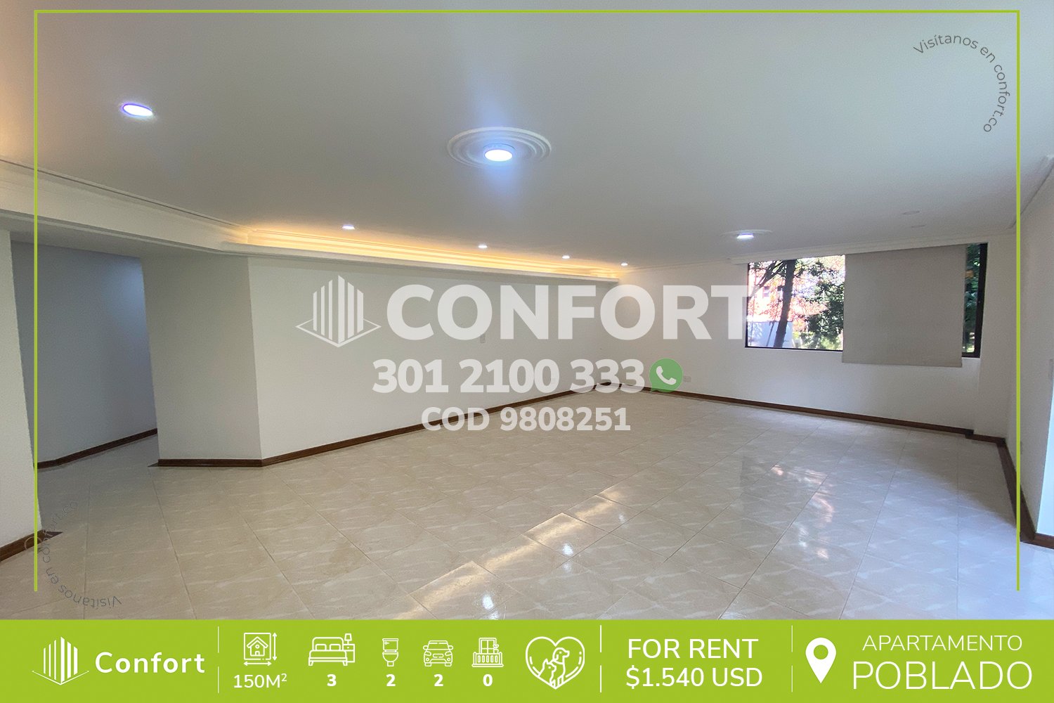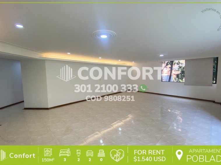 98-08-251 Inmobiliaria en Medellín arrienda apartamento ubicado en el sector de La Florida en El Poblado, cuenta con un área de 150mt2 distribuidos en sala comedor, cocina semi integral, zona de ropas, 3 habitaciones con clóset, una de ellas con vestier y baño privado, habitación de servicio, zona de estudio con biblioteca, baño social y parqueadero doble lineal. Ubicado en unidad con seguridad privada 24/7 y zonas comunes tales como parque infantil, salón social, piscina y zona verde con arcos de microfútbol, a su alrededor podemos encontrar el parque lineal La Presidenta, parque Lleras y el centro empresarial San Fernando, con vías de acceso por la avenida El Poblado, calle 7 y gran variedad de rutas de transporte público. CONFORT GESTORES INMOBILIARIOS – Arriendo en El Poblado