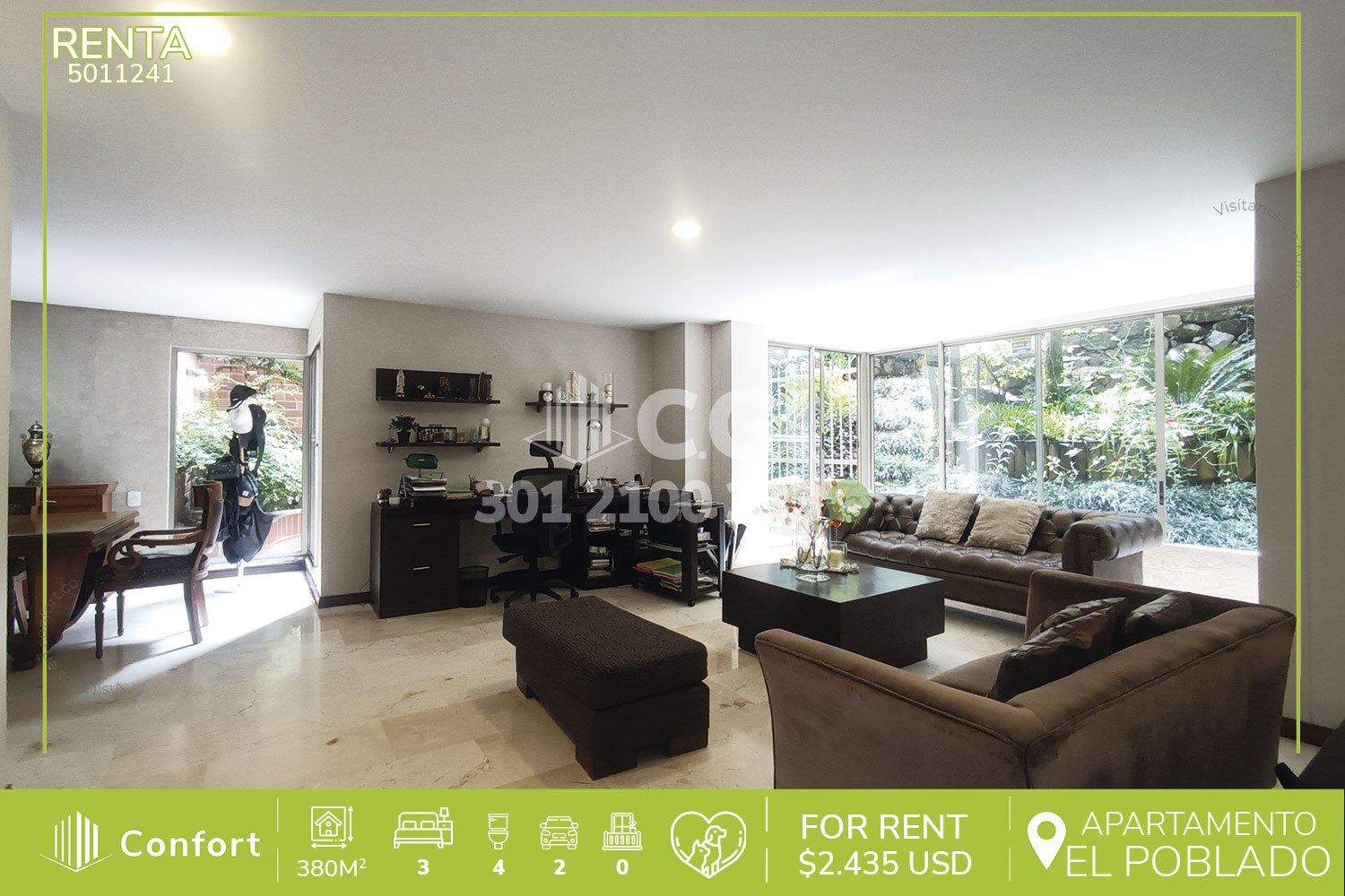 50-11-241 Inmobiliaria en Medellín arrienda apartamento ubicado en el sector de la Florida en el Poblado, cuenta con un área de 380mt2 distribuidos en sala comedor espaciosa, cocina integral con comedor auxiliar, zona de ropas, habitación de servicio con baño privado, 3 habitaciones de excelente tamaño con baño privado, adicional podemos encontrar sala de estar o televisión, 2 terrazas, closet de linos, baño social, 2 parqueaderos y cuarto útil. Ubicado en edificio con seguridad 24/7 con zonas de esparcimiento como salón social, parque infantil y piscina. A su alrededor podemos encontrar 23 hotel y super mercado Euro, con vías de acceso por Avenida el Poblado y Transversal Inferior, variedad de rutas de transporte público. CONFORT GESTORES INMOBILIARIOS – Arriendo en el Poblado