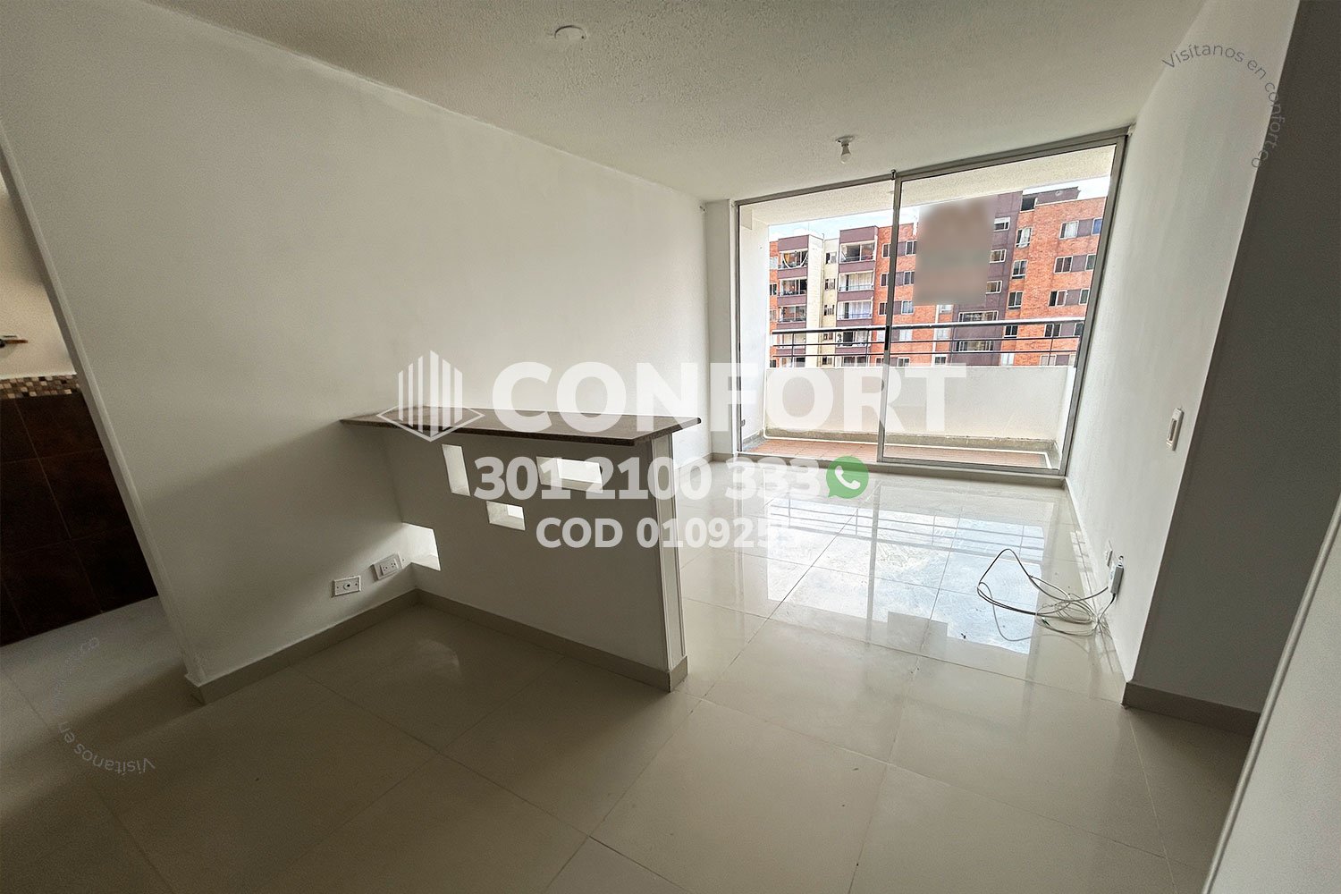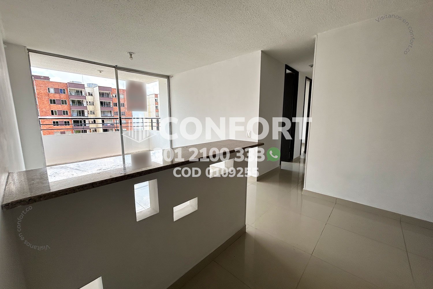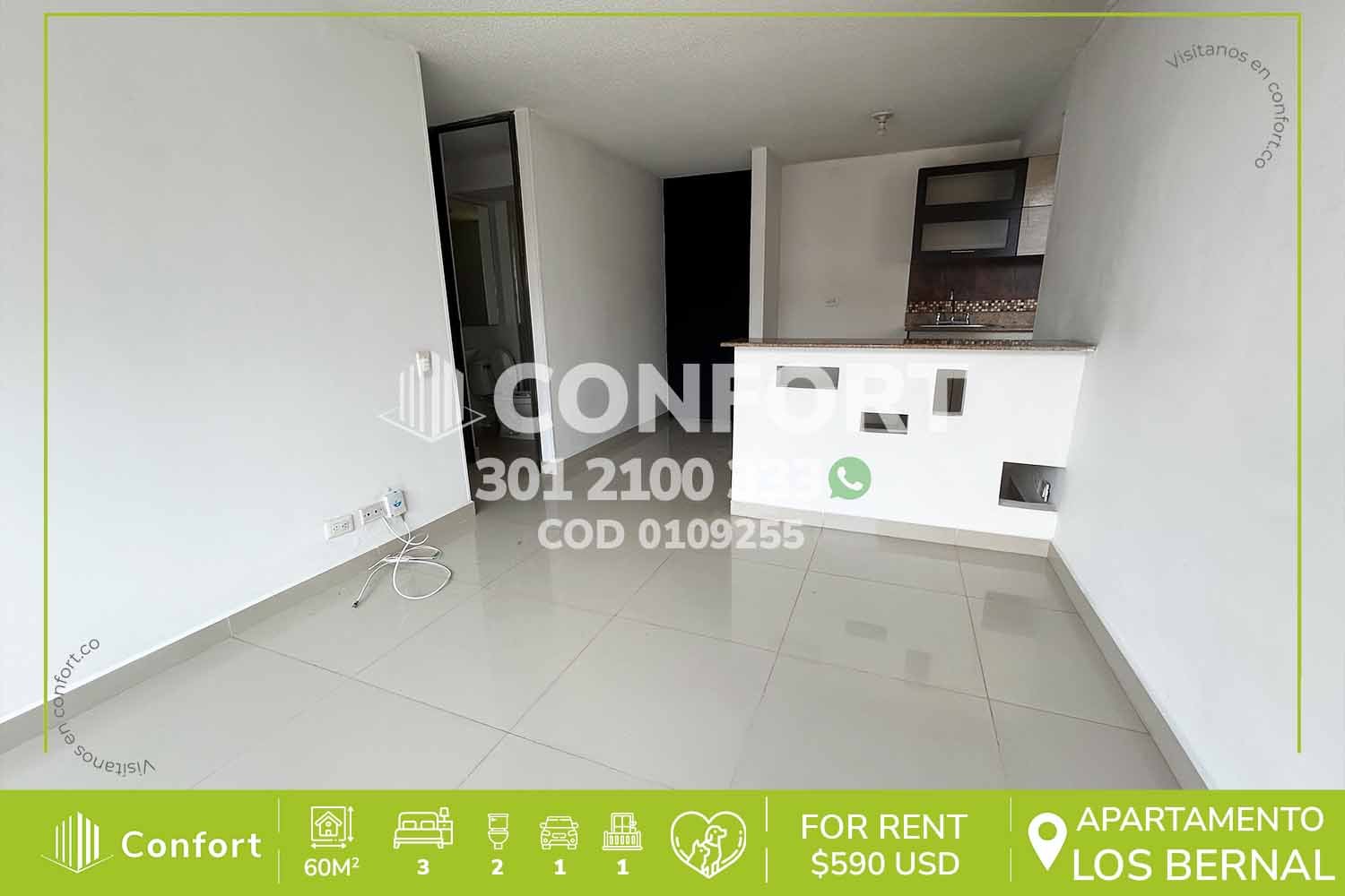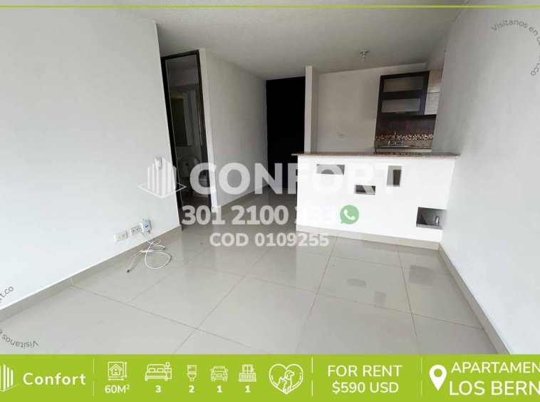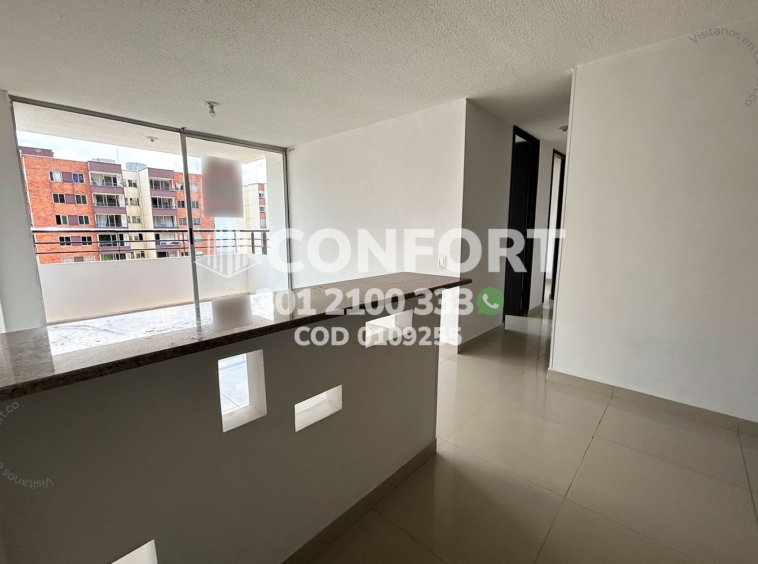 01-09-255 Inmobiliaria en Medellín arrienda apartamento ubicado en el sector de La Loma de los Bernal, cuenta con un área de 60mt2 distribuidos en sala comedor, cocina semi integral con barra americana, zona de ropas, balcón, 3 habitaciones con clóset, una de ellas con baño privado, baño social y parqueadero descubierto. Ubicado en unidad con seguridad privada 24/7 y zonas comunes como salón social, zona infantil y zonas verdes, a su alrededor podemos encontrar tiendas Euro, Mall Gran Vía, vías de acceso por las calles 8, 18 y gran variedad de transporte público. CONFORT GESTORES INMOBILIARIOS – Arriendo en Medellín