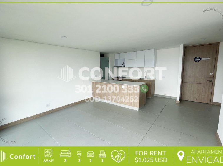 137-04-252 Inmobiliaria en Medellín arrienda apartamento ubicado en el sector de La Loma del Barro en Envigado, cuenta con un área de 85mt2 distribuidos en sala comedor, cocina integral con barra americana, zona de lavado, 3 habitaciones, la principal con vestier y baño privado, baño social, amplio balcón, sala de estudio, 2 parqueaderos y un cuarto útil. Ubicado en edificio con seguridad privada 24/7 y zonas comunes pendientes a entregar tales como piscina para adultos y niños, parque infantil, cancha de fútbol, salón social y zonas verdes, a su alrededor podemos encontrar el centro comercial Mayorca y el estadio Polideportivo Sur , con vías de acceso por La Loma del Barro, avenida El Poblado y gran variedad de rutas de transporte público. CONFORT GESTORES INMOBILIARIOS – Arriendo en Envigado