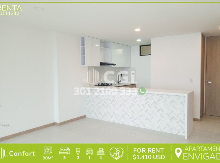 01-11-242 Inmobiliaria en Medellín arrienda apartamento ubicado en el sector de la Loma del Escobero en Envigado, cuenta con un área de 90mt2 distribuidos en sala comedor de muy buen espacio, cocina integral con Barra americana, zona de ropas, balcón con vista panorámica, sala de estudio, 3 habitaciones, la principal de ellas con baño privado y vestier, adicional baño social, parqueadero y cuarto útil, Ubicado en unidad residencial con seguridad 24/7 y con zonas comunes en construcción. A su alrededor podemos encontrar Centro Comercial City Plaza, Droguería Farmatodo, supermercado Carulla, con rutas de acceso por transversal intermedia, Loma el Escobero y gran variedad de rutas de transporte público. CONFORT GESTORES INMOBILIARIOS – Arriendo en Envigado