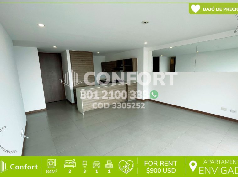33-05-252 Inmobiliaria en Medellín arrienda apartamento ubicado en excelente sector de El Escobero en Envigado, cuenta con un área de 84mt2 distribuidos en sala comedor espaciosa, moderna cocina integral, zona de ropas, 2 habitaciones de excelente tamaño con baño privado, una con vestier y otra con clóset, adicional podemos encontrar baño social, amplio balcón con espectacular vista, parqueadero y cuarto útil. Ubicado en urbanización con seguridad 24/7 y con zonas de esparcimiento como piscinas, salón social, salón de juegos, turco, sauna, gimnasio, cancha de squash, salón de cocina, parque infantil, zona pet y minimercado, a su alrededor podemos encontrar el centro comercial City Plaza y Mall Guadalcanal, con vías de acceso por la transversal intermedia y gran variedad de transporte público. CONFORT GESTORES INMOBILIARIOS – Arriendo en Envigado
