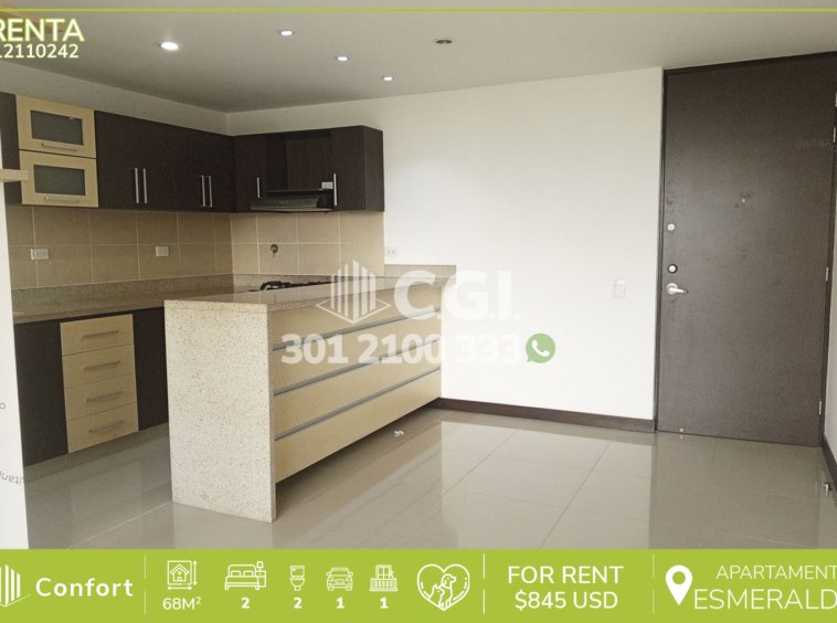 121-10-242 Inmobiliaria en Medellín arrienda apartamento ubicado en tranquilo sector de Loma del Esmeraldal en Envigado, cuenta con 68mt2 distribuidos en sala comedor de muy buen espacio, cocina integral con barra americana, zona de ropas, balcón,2 habitaciones, una de ellas con baño privado, vestier y la otra con clóset, baño social, parqueadero y cuarto útil. Ubicado en unidad con seguridad 24/7 y con zonas comunes como piscina para niños y adultos, salón social, parque infantil, gimnasio, zona de mascotas, placa polideportiva y zonas verdes, a su alrededor podemos encontrar Euro Supermercados, La Frontera y Smartfit, con rutas de acceso por transversal intermedia, avenida El Poblado y gran variedad de rutas de transporte público. CONFORT GESTORES INMOBILIARIOS – Arriendo en Envigado