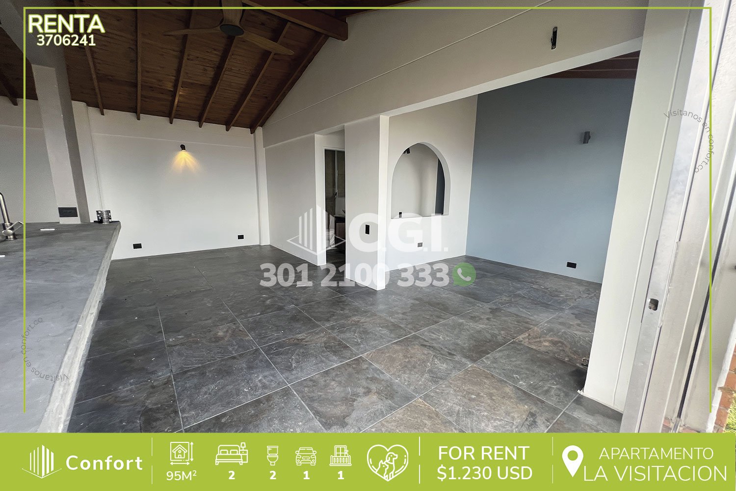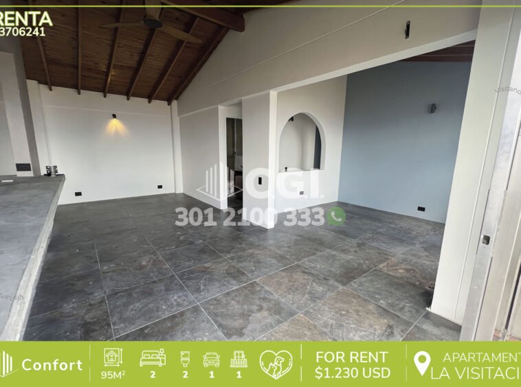 37-06-241 Apartamento rústico disponible para la renta ubicado en tranquilo sector de La Visitación en El Poblado, cuenta con 95mt2 distribuidos en sala comedor de muy buen espacio, balcón con vista panorámica, cocina integral con barra americana, zona de ropas, 2 habitaciones una de ellas con baño privado y vestier, aire acondicionado, clóset, baño social, parqueadero y cuarto útil, con vigilancia 24/7 y zonas comunes como piscina para niños y adultos, salón social, turco, sauna y parque infantil. A su alrededor podemos encontrar el Centro Comercial El Tesoro, UVA El Tesoro, Mall La Visitación, rutas de acceso por avenida Los González, transversal inferior y gran variedad de transporte público. CONFORT GESTORES INMOBILIARIOS – Arriendo en El Poblado