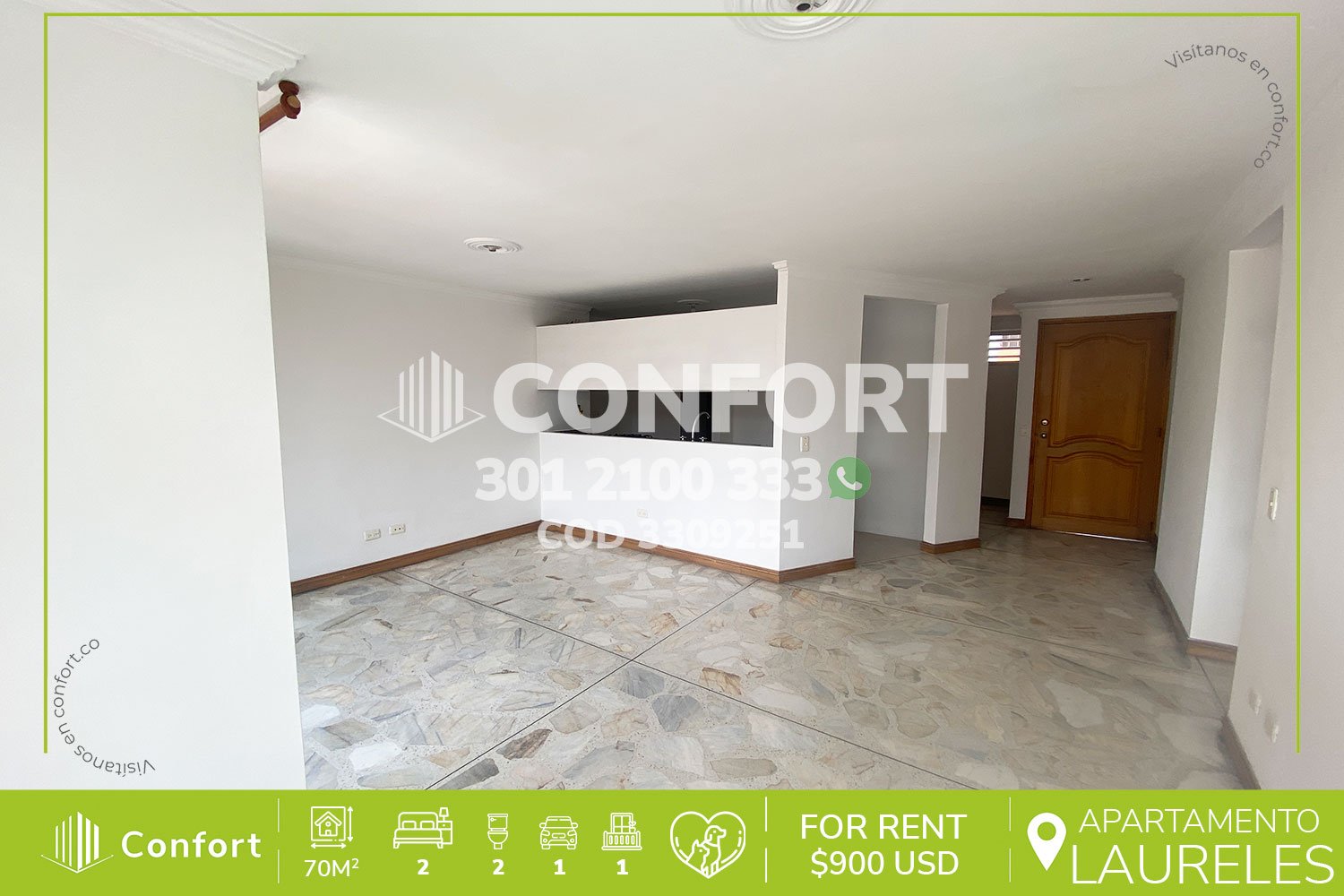 34-09-253 Inmobiliaria en Medellín arrienda apartamento ubicado en las Acacias en Laureles. Cuenta con un área de 70mt2 distribuidos en sala comedor, cocina integral, zona de ropas, balcón, 2 habitaciones, la principal de ellas con baño privado, adicional 1 baño social y parqueadero. Ubicado en edificio residencial con seguridad 24/7 y zonas comunes como picina, sauna, turco, salón social y gimnasio. A su alrededor podemos encontrar mall Laureles, Viva Laureles, con vías de acceso por Avenida 33 y calle 34. CONFORT GESTORES INMOBILIARIOS – Arriendo en Laureles