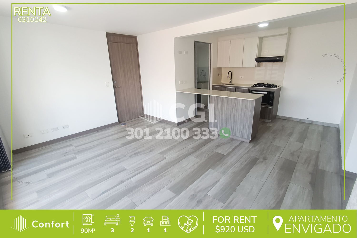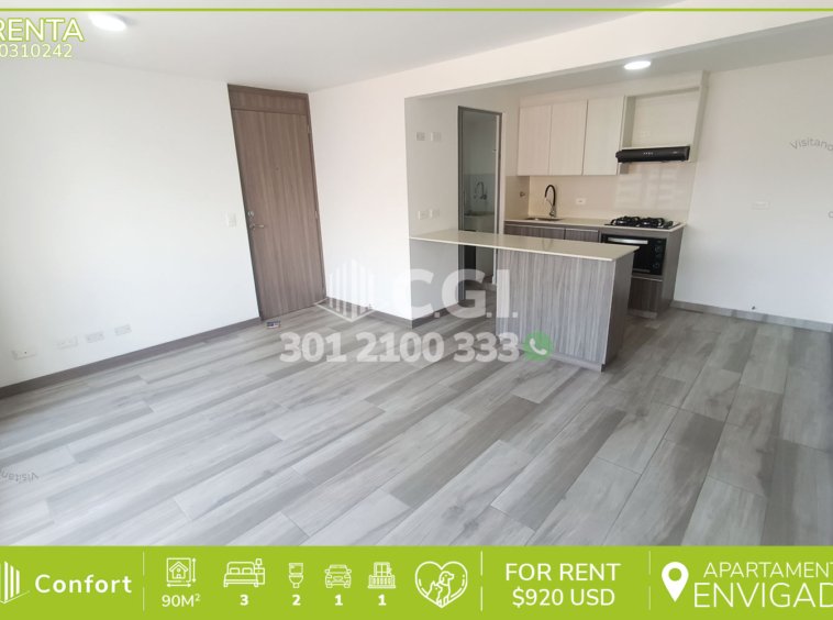 03-10-242 Inmobiliaria en Medellín arrienda apartamento en excelente sector de Las Brujas en Envigado, cuenta con un área aproximada de 90mt2 distribuidos en sala comedor, cocina integral moderna, zona de ropas, 3 habitaciones de excelente tamaño, la habitación principal cuenta con amplio vestier y baño privado, adicional podemos encontrar un baño social, área de estudio o televisión y amplio balcón con agradable vista, además de parqueadero y cuarto útil. Ubicado en unidad con seguridad 24/7 con zonas de esparcimiento como piscinas, salón social, gimnasio, placa polideportiva, parque infantil y zona pet. A su alrededor podemos encontrar centro comercial City Plaza y universidad de Envigado, con vías de acceso por Avenida el Poblado y Transversal Intermedia, variedad de rutas de transporte público. CONFORT GESTORES INMOBILIARIOS – Arriendo en Envigado
