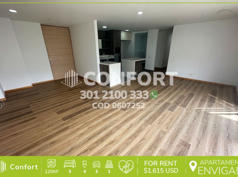 06-07-252 Inmobiliaria en Medellín arrienda apartamento ubicado en el sector de las Brujas en Envigado. Cuenta con un área de 120mt2 distribuidos en sala comedor, cocina semi integral, zona de ropas, balcón, 3 habitaciones cada una con baño privado, y la principal con vestier, además 1 baño social, 2 parqueaderos y cuarto útil. Se encuentra ubicado en unidad residencial con seguridad 24/7 y zonas comunes como piscinas para niños y adultos, salón social, gimnasio, parque infantil. Ubicado en unidad con seguridad privada 24/7 y zonas comunes como piscina de adultos y niños, turco, zona de mascotas, parque infantil, salón social, gimnasio, cancha de squash y zonas verdes, a su alrededor podemos encontrar el centro comercial City Plaza, Tiendas D1, vías de acceso por la transversal intermedia, Loma de Las Brujas, Loma del Escobero y gran variedad de rutas de transporte público. CONFORT GESTORES INMOBILIARIOS – Arriendo en Envigado