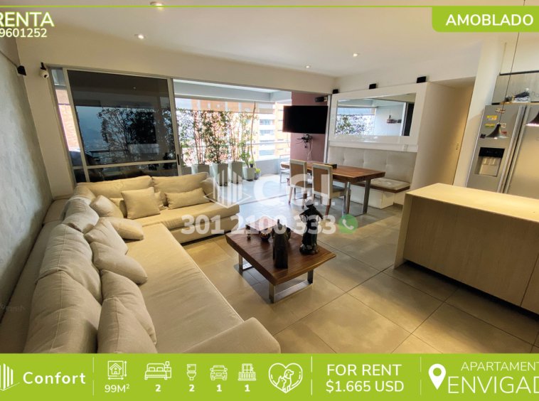 96-01-252 Inmobiliaria en Medellín arrienda apartamento amoblado ubicado en el sector de Las Brujas en Envigado, cuenta con un área de 99mt2 distribuidos en sala comedor, cocina integral, balcón, zona de ropas, 2 habitaciones, una de ellas con baño privado y vestier, otra con clóset, baño social, parqueadero y cuarto útil. Ubicado en unidad con seguridad privada 24/7 y zonas comunes como piscina para niños y adultos, salón social, gimnasio, cancha de fútbol, voleibol, parque infantil y zonas verdes, a su alrededor podemos encontrar el centro comercial City Plaza, hospital Manuel Uribe Ángel y tiendas D1, con vías de acceso por la avenida El Poblado, transversal intermedia y gran variedad de transporte público. CONFORT GESTORES INMOBILIARIOS – Arriendo en Envigado