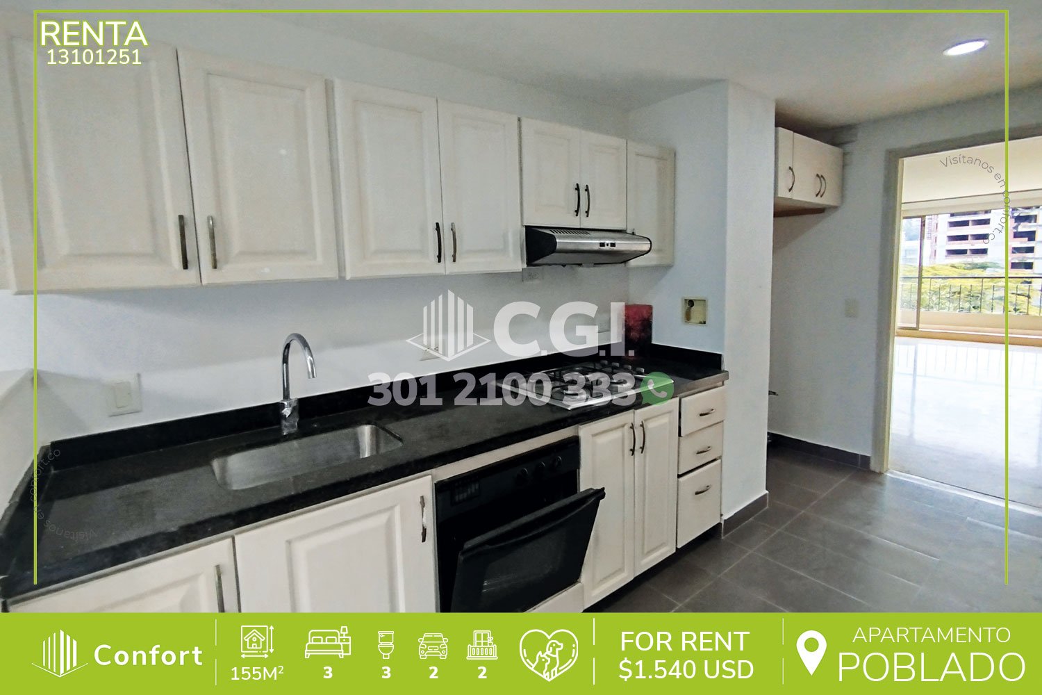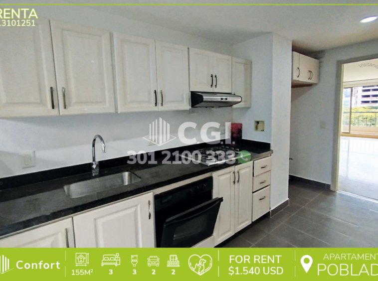 131-01-251 Inmobiliaria en Medellín arrienda apartamento ubicado en el sector de Las Palmas en El Poblado, cuenta con un área de 155 mt2 distribuidos en sala comedor, cocina integral, balcón, zona de ropas, 3 habitaciones, 2 de ellas con baño privado y la habitación principal además cuenta con balcón privado y vestier, habitación de servicio, sala de estudio, 2 parqueaderos y cuarto útil. Ubicado en edificio que cuenta con seguridad privada 24/7 y zonas comunes tales como parque infantil y salón social, a su alrededor podemos encontrar Palma Grande Mall Comercial, Euro Palma Grande y colegio Destiny, con vías de acceso por la avenida Las Palmas y gran variedad de rutas de transporte público. CONFORT GESTORES INMOBILIARIOS – Arriendo en El Poblado