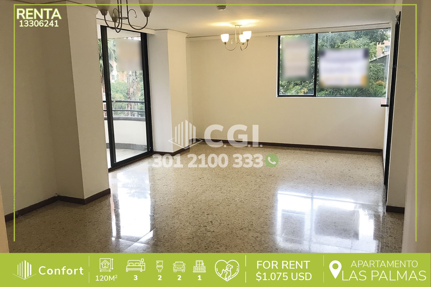 133-06-241 Apartamento disponible para la renta ubicado en tranquilo sector de Las Palmas en El Poblado, este cuenta con 120 m² distribuidos en espaciosa sala comedor, balcón, cocina semi integral con iluminación completa, zona de ropas, terraza, 3 habitaciones (una con baño privado y vestier), 2 clósets, baño social, habitación de servicio con baño privado y 2 parqueaderos, con vigilancia 24/7 y zonas comunes como salón social y espacio de acondicionamiento físico. A sus alrededores se encuentra el Country Club, el restaurante Hato Viejo y el Túnel de Oriente, además, cuenta con acceso a rutas de acceso como la Avenida Las Palmas y una amplia variedad de rutas de transporte público. CONFORT GESTORES INMOBILIARIOS – Arriendo en El Poblado