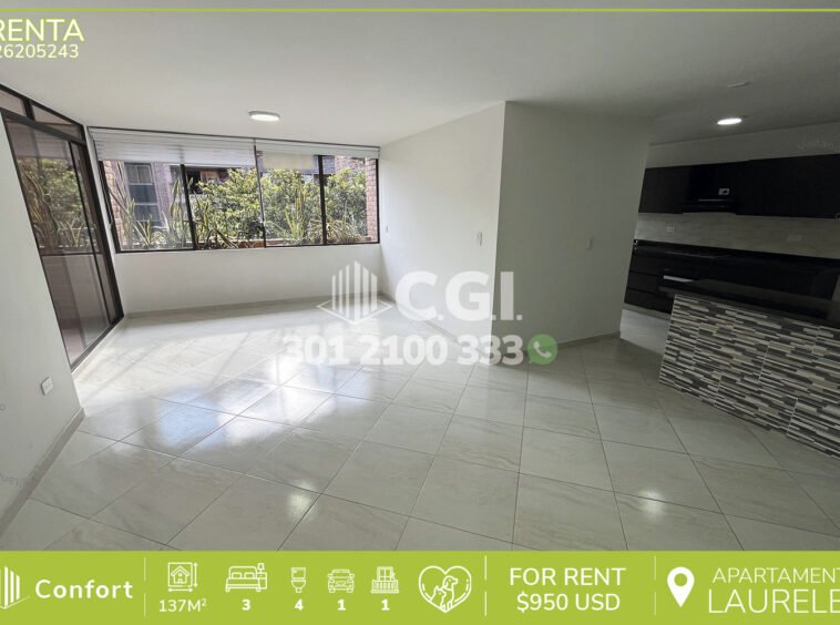 262-05-243 Apartamento disponible para la renta en el sector de Laureles en Medellín, cuenta con 137 mt2 distribuidos en 3 habitaciones, 4 baños, habitación de servicio, sala, comedor, cocina integral, sala de estudio, balcón, vestier, zona de ropas, parqueadero y servicio de vigilancia 24/7, con zonas comunes como salón común para todo el edificio con mesas para compartir. A su alrededor podemos encontrar el Éxito de Laureles, el primer parque de Laureles y el segundo parque Laureles, con rutas de acceso como avenida Nutibara, avenida jardín y calle 35. CONFORT GESTORES INMOBILIARIOS – Arriendo en Medellín