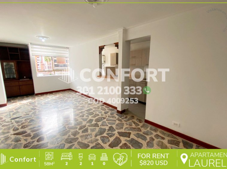 40-29-253 Inmobiliaria en Medellín arrienda apartamento ubicado en los Conquistadores en Laureles. Cuenta con un área de 58mt2 distribuidos en sala comedor, cocina integral, zona de ropas, 2 habitaciones, la principal de ellas con baño privado, adicional a 1 baño social y parqueadero paralelo. Ubicado en edificio con seguridad 24/7. A su alrededor podemos encontrar centro comercial Unicentro, universidad UPB, con acceso por avenida 66b y calle 42, con variedad de rutas de transporte público. CONFORT GESTORES INMOBILIARIOS – Arriendo en Medellín