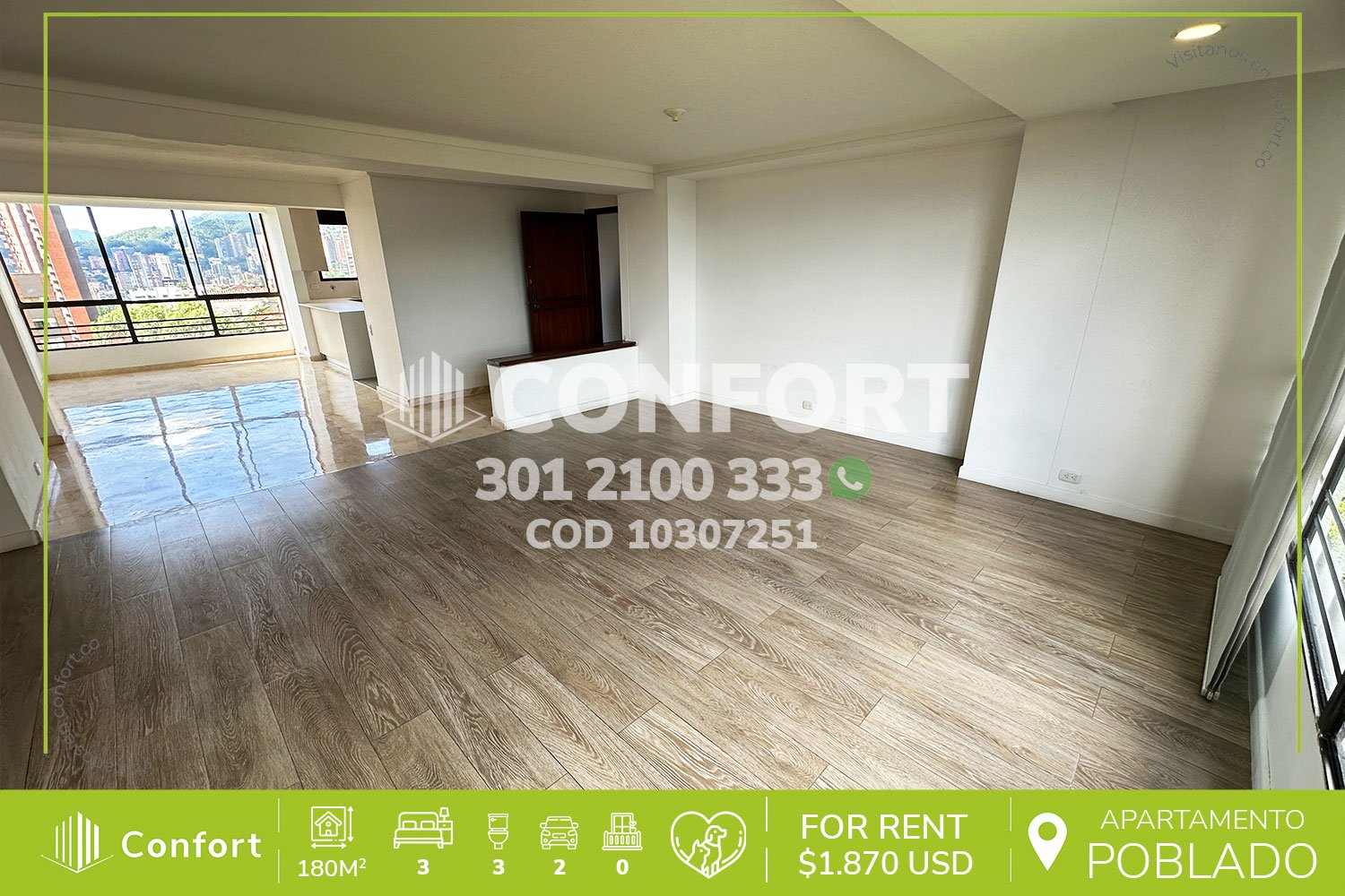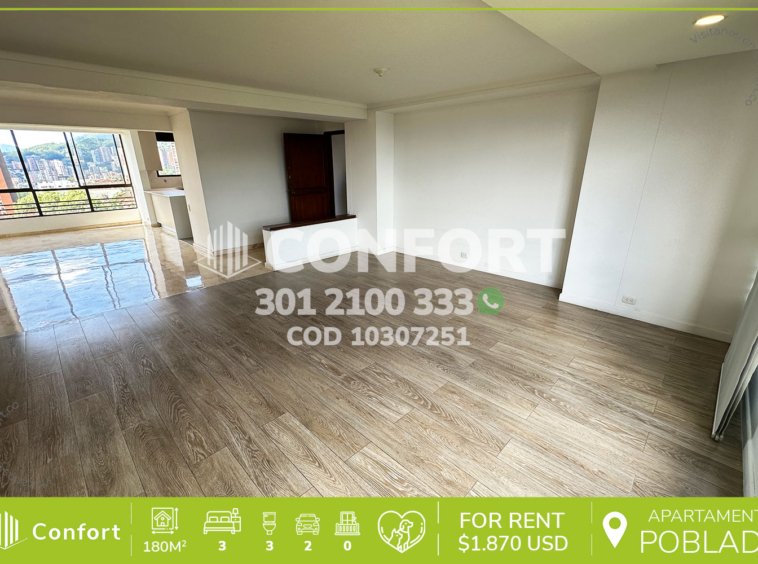 103-07-251 Inmobiliaria en Medellín arrienda apartamento ubicado en el sector de Los Balsos en El Poblado, cuenta con un área de 180mt2 distribuidos en sala, comedor, cocina integral con barra americana, zona de ropas, 3 habitaciones, 2 de ellas con baño privado, una con vestier, 2 con clóset, sala de estudio, baño social, habitación de servicio con su respectivo baño, 2 parqueaderos y cuarto útil. Ubicado en unidad con seguridad privada 24/7 y zonas comunes como piscina, turco, sauna, salón social y juegos infantiles, a su alrededor podemos encontrar Price Smart, centro comercial El Rosario y el centro comercial El Tesoro, con vías de acceso por la transversal superior, Loma de Los Balsos y amplia variedad de rutas de transporte público. CONFORT GESTORES INMOBILIARIOS – Arriendo en El Poblado