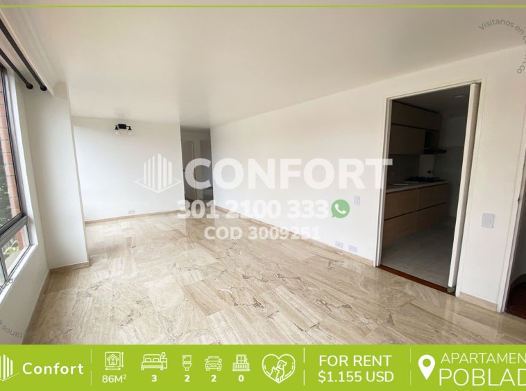 30-09-251 Inmobiliaria en Medellín arrienda apartamento ubicado en los Balsos en el Poblado. Cuenta con un área de 86mt2 distribuidos en sala comedor, cocina integral, zona de ropas, 3 habitaciones, la principal de ellas con baño privado, adicional 1 baño social, el apartamento está totalmente remodelado, 1 parqueadero. Ubicado en edificio con seguridad privada 24/7 que cuenta con zona infantil y zonas verde. A su alrededor podemos encontrar Euro de los balsos, Mall Plaza Bella, con vías de acceso por la transversal inferior, loma de los Balsos y variedad de rutas de transporte público. CONFORT GESTORES INMOBILIARIOS – Arriendo en El Poblado