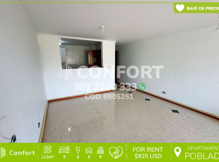 69-05-251 Inmobiliaria en Medellín arrienda apartamento ubicado en el sector del Los Balsos en El Poblado, cuenta con un área de 115mt2 distribuidos en sala comedor, cocina integral, zona de ropas, 3 habitaciones, una de ellas con baño privado y vestier, 2 con clóset, baño social, 2 parqueaderos y cuarto útil. Ubicado en unidad con seguridad privada 24/7 y zonas comunes tales como salón social y zonas verdes, a su alrededor podemos encontrar el centro comercial Santafé, Rosa Mística y el Museo el Castillo, con vías de acceso por la avenida El Poblado, Los balsos y gran variedad de transporte público. CONFORT GESTORES INMOBILIARIOS – Arriendo en El Poblado