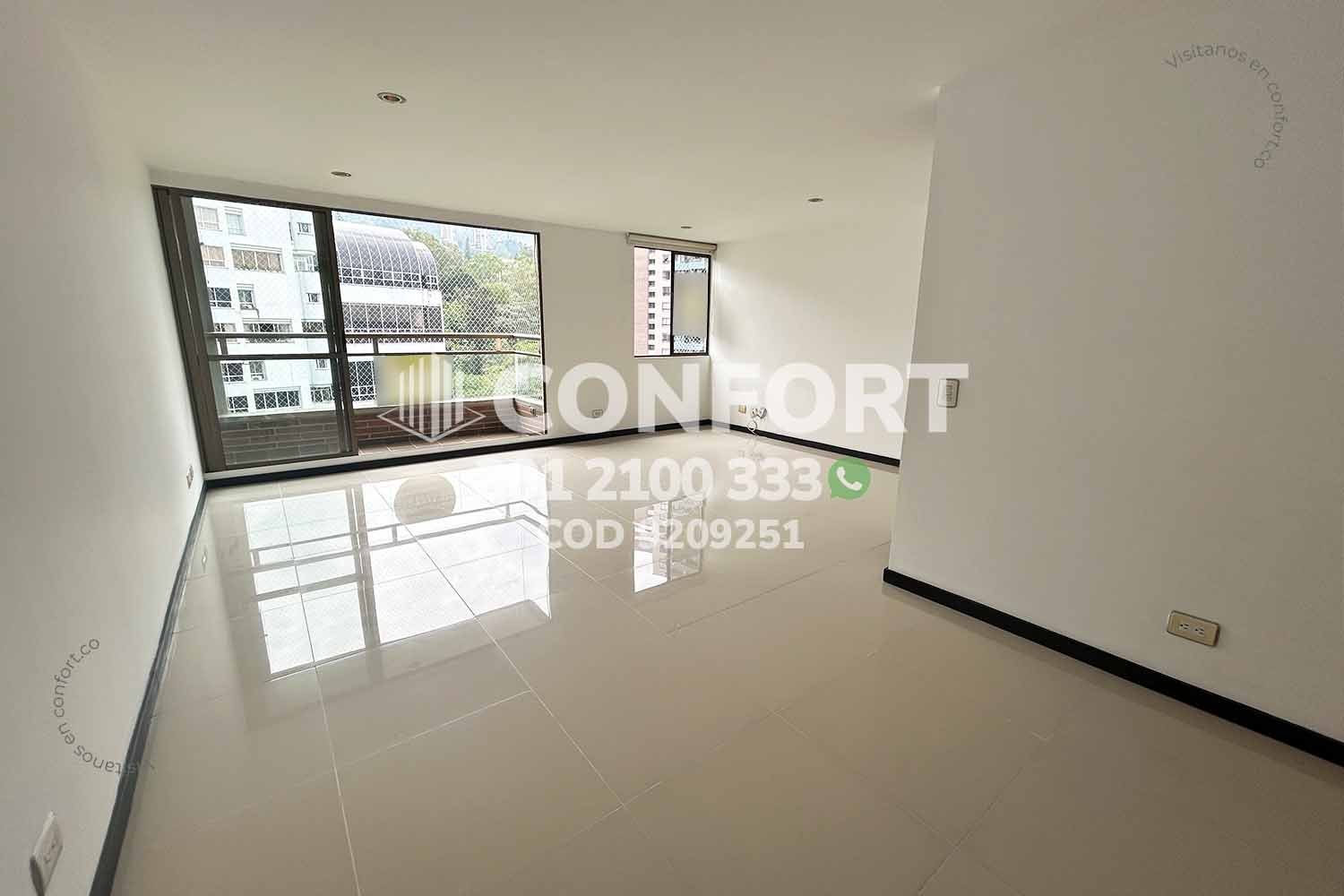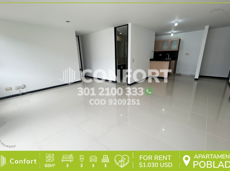 92-09-251 Inmobiliaria en Medellín arrienda apartamento ubicado en el sector de Los Balsos en El Poblado; cuenta con un área de 68m², distribuidos en salacomedor, cocina integral, zona de ropas, 2 habitaciones (1 de ellas con baño privado y vestier), baño social, parqueadero y cuarto útil. Ubicado en unidad con seguridad privada 24/7 y zonas comunes tales como piscina, gimnasio, salón social, área de ping-pong y zona infantil, a su alrededor podemos encontrar el centro comercial El Tesoro, clínica del Rosario y UVA de El Poblado, con vías de acceso por la transversal inferior, avenida El Poblado y gran variedad de transporte público. CONFORT GESTORES INMOBILIARIOS – Arriendo en El Poblado