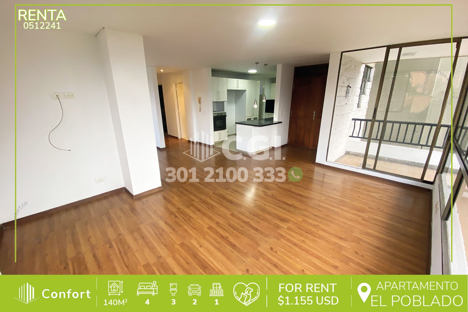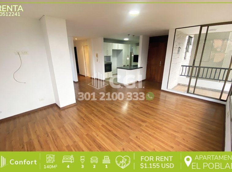 05-12-241 Inmobiliaria en Medellín arrienda apartamento ubicado en el sector de Los Parra en El Poblado, cuenta con un área de 140mt2 distribuidos en sala comedor, cocina integral con barra americana, sala de estudio, zona de ropas, balcón, 4 habitaciones, una de ellas con baño privado y vestier, 3 con clóset, 2 baños sociales, habitación de servicio con su respectivo baño privado, 2 parqueaderos y cuarto útil. Ubicado en edificio con seguridad privada 24/7 y zonas verdes, a su alrededor podemos encontrar Mall La Visitacion, Mall Ventura y Farmatodo, con rutas de acceso por la avenida El Poblado, transversal inferior y gran variedad de transporte público. CONFORT GESTORES INMOBILIARIOS – Arriendo en El Poblado