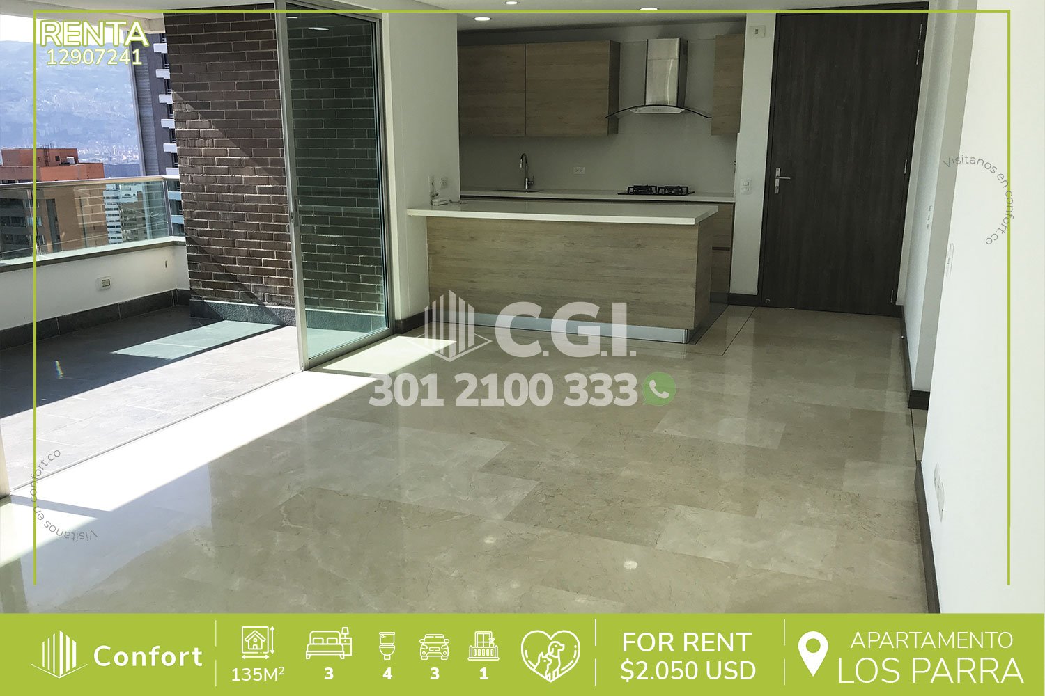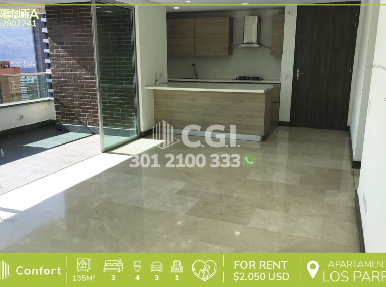 129-07-241 Inmobiliaria en Medellín arrienda moderno apartamento ubicado en tranquilo sector de Los Parra en El Poblado, el cual cuenta con 135mt2 distribuidos en sala comedor con muy buena iluminación, balcón con vista panorámica, cocina integral con barra americana, zona de ropas, 3 habitaciones cada una cuenta con su respectivo baño privado, una de ellas con vestier y las otras dos con clóset, sala de estudio, baño social, habitación de servicio con su respectivo baño, 3 parqueaderos y cuarto útil, con vigilancia 24/7 y zonas comunes como piscina para niños y adultos, gimnasio, salón social, turco, cancha de squash y parque infantil. A su alrededor podemos encontrar Farmatodo, mall Zona Dos y Euro Supermercados, con rutas de acceso por avenida El Poblado, Loma Los Parra y gran variedad de transporte público. CONFORT GESTORES INMOBILIARIOS – Arriendo en El Poblado