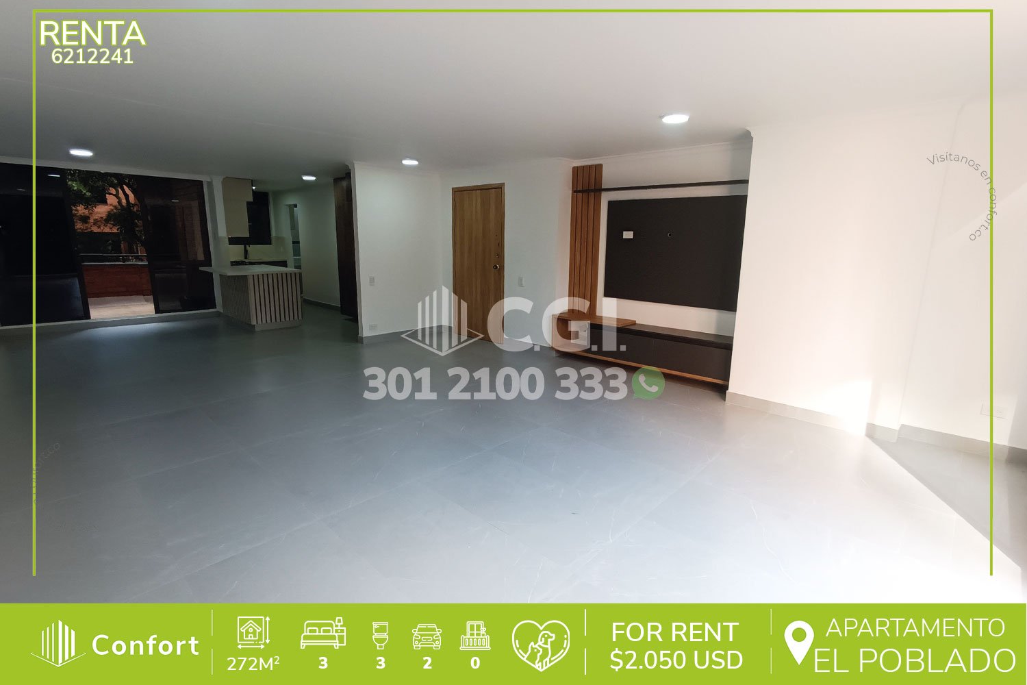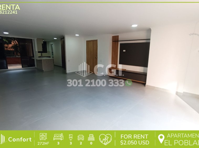 62-12-241 Inmobiliaria en Medellín arrienda apartamento remodelado ubicado en excelente sector de Los Parra en El Poblado, cuenta con un área de 272mt2 distribuidos en sala comedor espaciosa, moderna cocina integral, zona de ropas, habitación de servicio con baño privado, 3 habitaciones de excelente tamaño, la habitación principal cuenta con amplio vestier y baño privado, adicional podemos encontrar área de estudio o sala de estar, 2 baños sociales, amplia terraza que rodea todo el inmueble, 2 parqueaderos y cuarto útil. Ubicado en urbanización con seguridad 24/7 y con zonas de esparcimiento como piscinas, kiosko, cancha de tenis y zonas verdes, a su alrededor podemos encontrar Mall La Visitación, con vías de acceso por la avenida El Poblado, transversal inferior y gran variedad de rutas de transporte público. CONFORT GESTORES INMOBILIARIOS – Arriendo en El Poblado