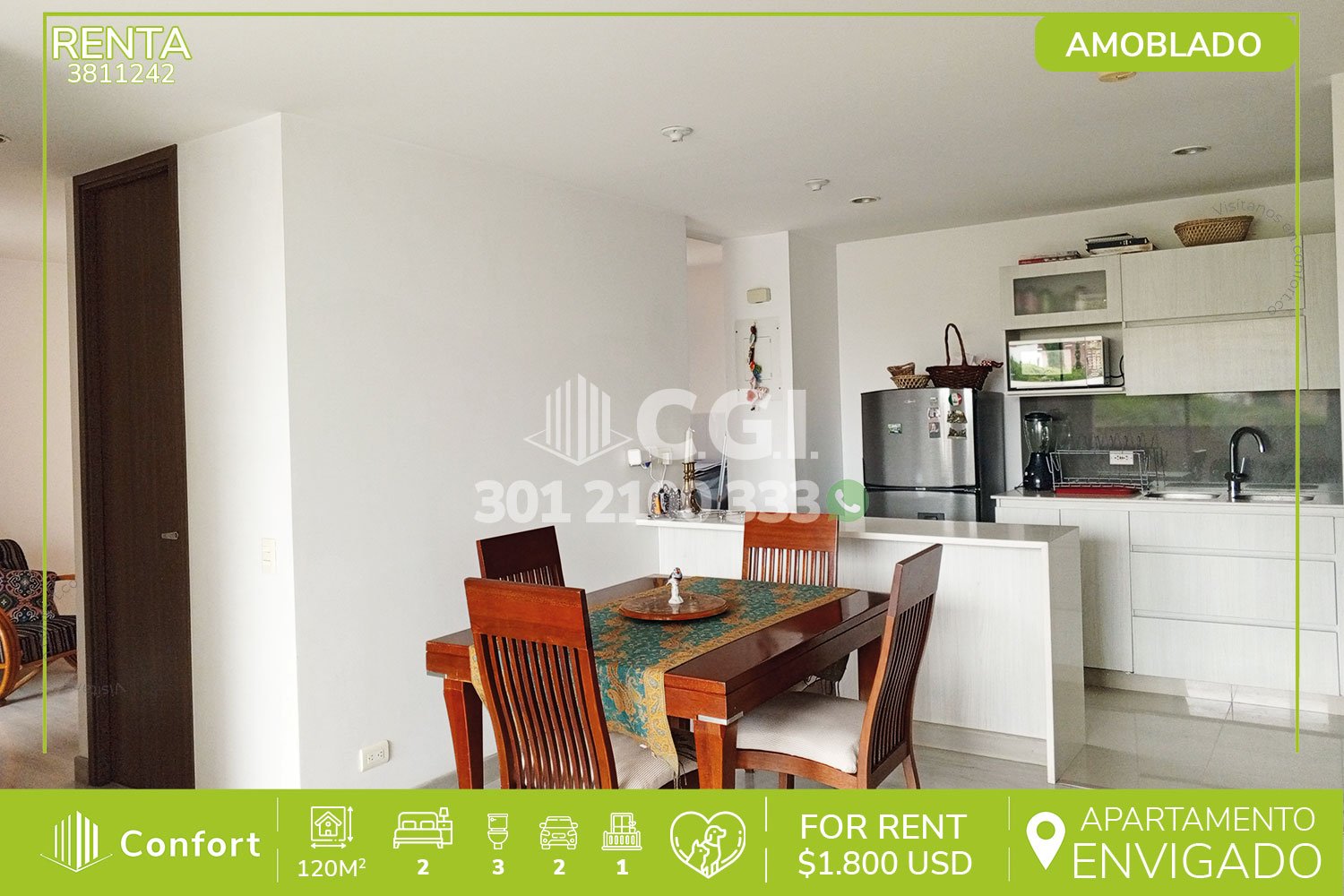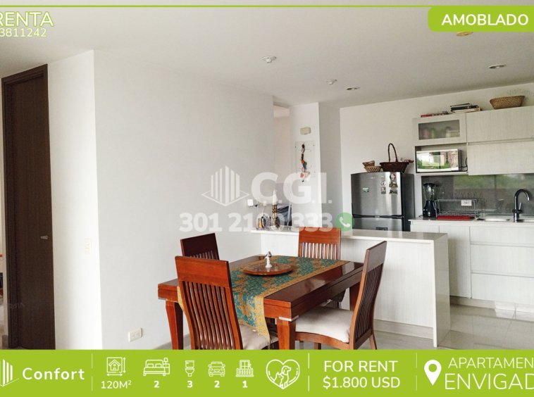 38-11-242 Inmobiliaria en Medellín arrienda apartamento amoblado ubicado en tranquilo sector de Montiel en Envigado, cuenta con un área de 120mt2 distribuidos en sala comedor de muy buen espacio, cocina integral con barra americana, zona de ropas, balcón, 2 habitaciones con su baño privado, una con vestier y la otra con clóset, baño social, parqueadero doble lineal y cuarto útil. Ubicado en unidad con seguridad 24/7 y con zonas comunes como piscina para niños y adultos, salón social, parque infantil, gimnasio, sauna, turco, cancha de squash, cancha de fútbol, zona de coworking, salón de juegos y zonas verdes, a su alrededor podemos encontrar el centro comercial San Lucas, Colegio Montessori y rutas de acceso por transversal intermedia, avenida El Escobero y gran variedad de rutas de transporte público. CONFORT GESTORES INMOBILIARIOS – Arriendo en Envigado