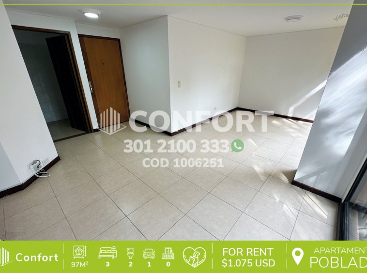 10-06-251 Inmobiliaria en Medellín arrienda apartamento ubicado en el sector de Oviedo en El Poblado, cuenta con un área de 97mt2 distribuidos en sala comedor, cocina integral, zona de ropas, 3 habitaciones, una de ellas con baño privado, vestier y aire acondicionado, 2 con clóset, baño social, habitación de servicio con su respectivo baño privado, parqueadero y cuarto útil. Ubicado en edificio con seguridad privada 24/7, donde a su alrededor podemos encontrar el centro comercial Oviedo, centro comercial Santafé, Clínica Las Vegas, con vías de acceso por las avenidas El Poblado, Las Vegas y gran variedad de transporte público. CONFORT GESTORES INMOBILIARIOS – Arriendo en El Poblado