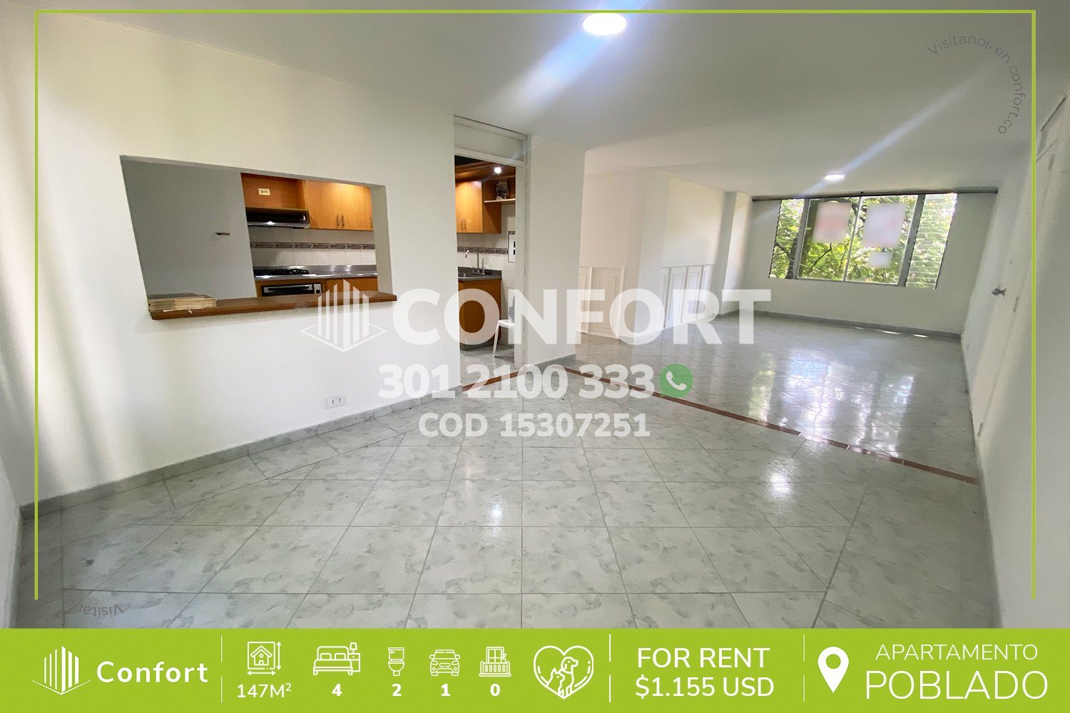 153-07-251 Inmobiliaria en Medellín arrienda apartamento ubicado en el sector de Patio Bonito en El Poblado, cuenta con área 147 mtr2 distribuidos en sala, comedor, cocina integral, zona de ropas, 4 habitaciones con clóset, una de ellas con vestier y baño privado, baño social, habitación de servicio con baño privado y parqueadero. Ubicado en unidad con seguridad privada 24/7 y zonas comunes tales como 5 piscinas, parque infantil, placa polideportiva y zonas verdes, a su alrededor podemos encontrar la universidad Eafit, colegio José Félix, vías de acceso por las avenidas El Poblado, Las Vegas y gran variedad de transporte público. CONFORT GESTORES INMOBILIARIOS – Arriendo en El Poblado
