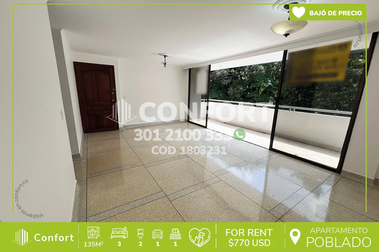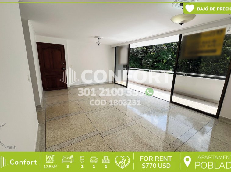 18-03-231 Inmobiliaria en Medellín arrienda apartamento ubicado en el sector de Patio Bonito en El Poblado, cuenta con un área de 135mts2 distribuidos en sala comedor, cocina integral, balcón, zona de ropas, 3 habitaciones, una de ellas con vestier y baño privado, 2 con clóset, baño social, habitación de servicio con baño y parqueadero cubierto. Ubicado en edificio con seguridad privada 24/7, donde a su alrededor podemos encontrar el centro comercial Oviedo, centro comercial Santafé, y el parque de El Poblado, con vías de acceso por las avenidas Las Vegas, El Poblado y gran variedad de transporte público. CONFORT GESTORES INMOBILIARIOS – Arriendo en El Poblado