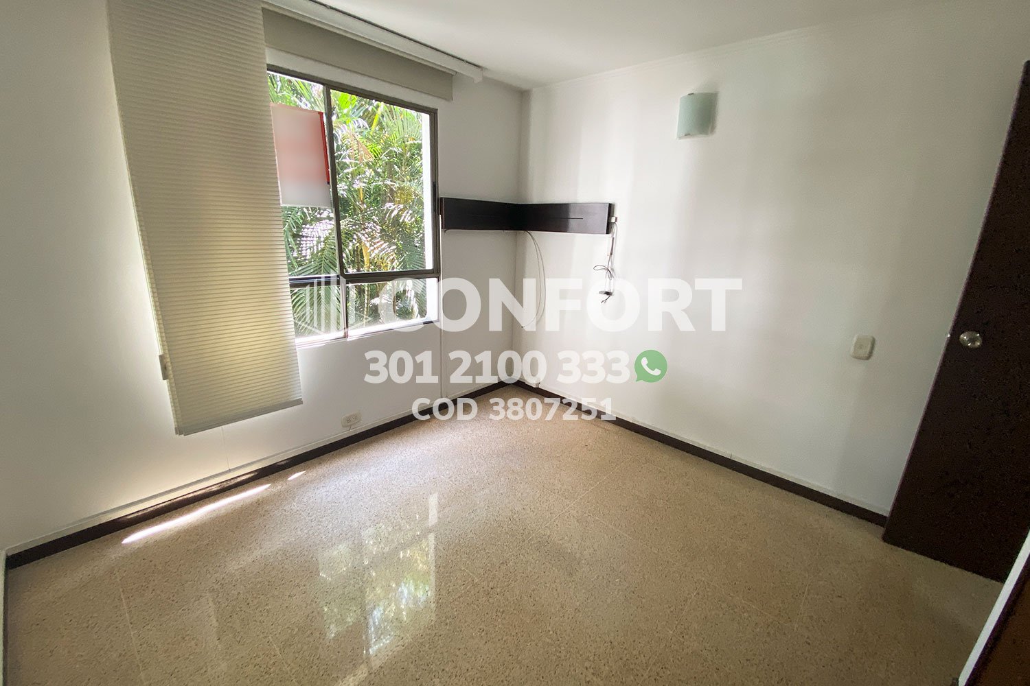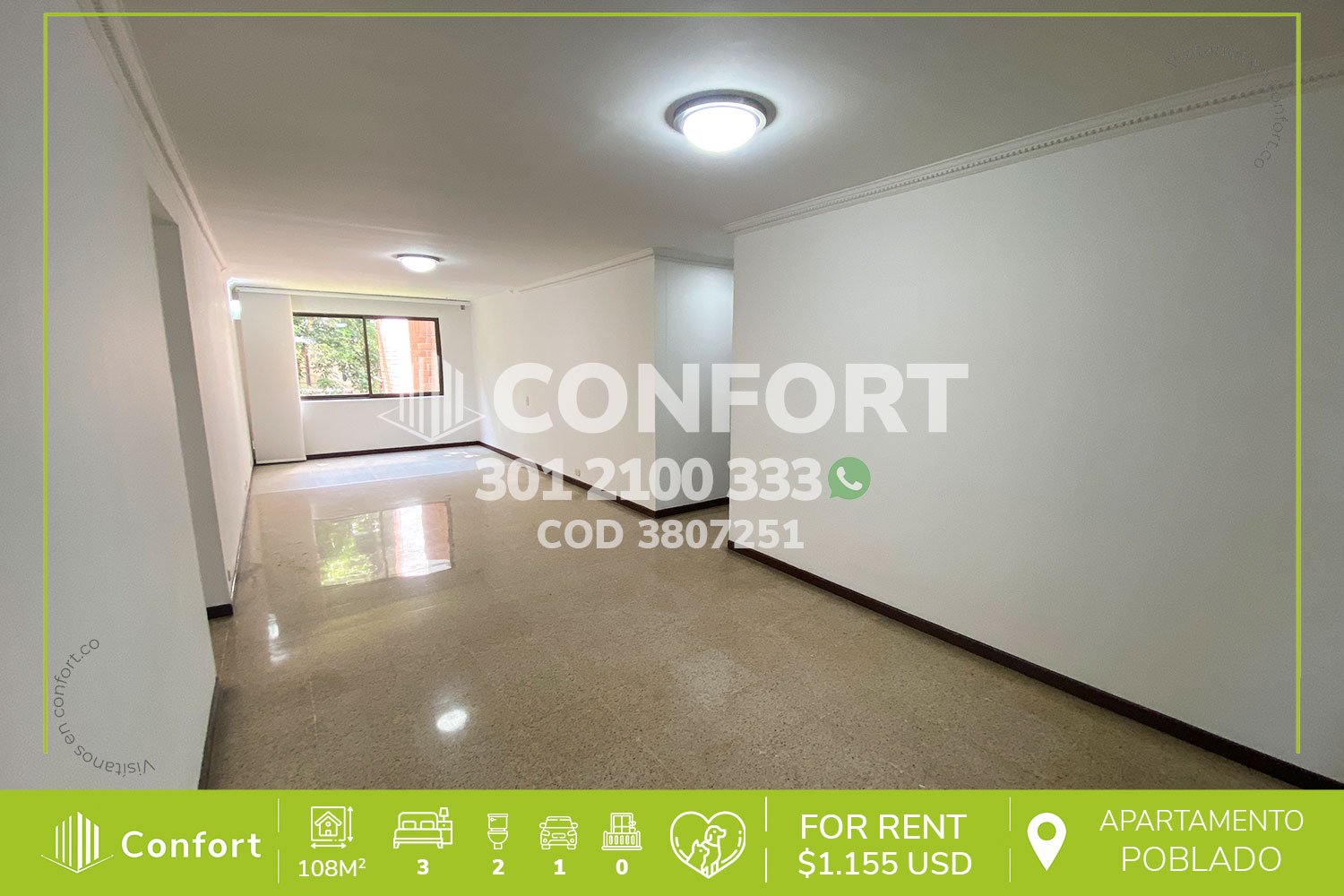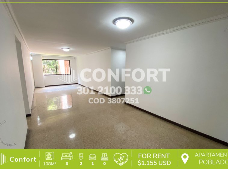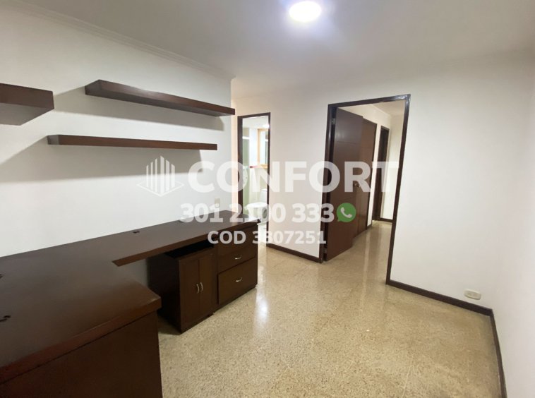 38-07-251 inmobiliaria en Medellín arrienda apartamento ubicado en el sector de Patio Bonito en el Poblado, cuenta con un área de 108mt2 distribuidos en cocina semi integral, sala, comedor, estudio, 3 habitaciones con closet, una de ellas con baño privado, 1 baño social, 1 parqueadero. Ubicado en unidad residencial con seguridad 24/7 sus zonas comunes se distribuyen en piscina, salón social y gimnasio. A su alrededor podemos encontrar el Institución José Félix, Universidad Eafit, avenida el Poblado y avenida las Vegas. CONFORT GESTORES INMOBILIARIOS – Arriendo en Poblado.