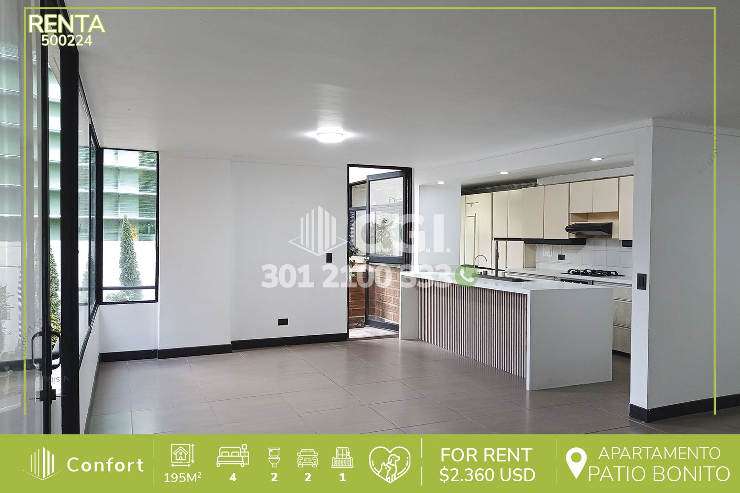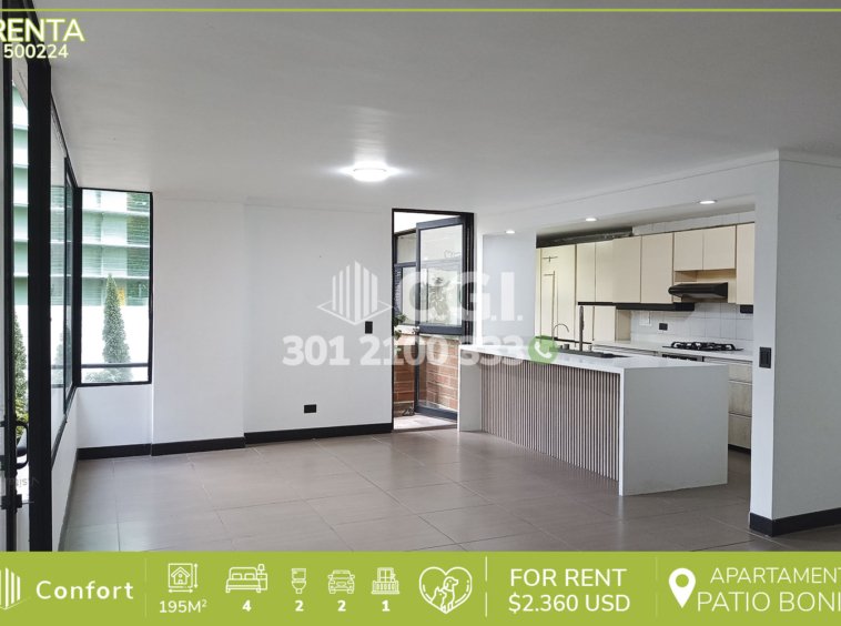 50-02-24 Inmobiliaria en Medellín arrienda espectacular apartamento con un área de 195mts² ubicado en El Poblado, sector Patio Bonito, este consta de 4 habitaciones, la principal con bañera, habitación de servicio con baño, baño social, sala comedor, cocina integral con horno y extractor, balcón, una amplia terraza ideal para tardes de ocio o reuniones familiares, zona de ropas y parqueadero doble lineal. El edificio residencial tiene amplias zonas verdes, parque infantil y portería 24/7. La ubicación del inmueble le permite cercanía a San Fernando Plaza, Milla de Oro, Parque del Poblado, Clínica Las Vegas y One Plaza Business Center, con rutas de acceso por Avenida El Poblado, Avenida Las Vegas y amplia variedad de rutas de transporte público. CONFORT GESTORES INMOBILIARIOS – Arriendo en El Poblado
