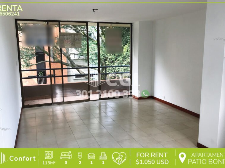 65-06-241 Apartamento disponible para la renta ubicado en el tranquilo sector de Patio Bonito en El Poblado, cuenta con 113mt2 distribuidos en sala comedor espaciosa, sala de estudio, cocina integral, zona de ropas, balcón, 3 habitaciones cada una con su respectivo clóset y una de ellas con baño privado, baño social, habitación de servicio con su respectivo baño, parqueadero y portería diurna. A su alrededor podemos encontrar la clínica Las Vegas, Éxito del Poblado, tiendas D1, rutas de acceso por avenida El Poblado, avenida Las Vegas y gran variedad de transporte público. CONFORT GESTORES INMOBILIARIOS – Arriendo en El Poblado