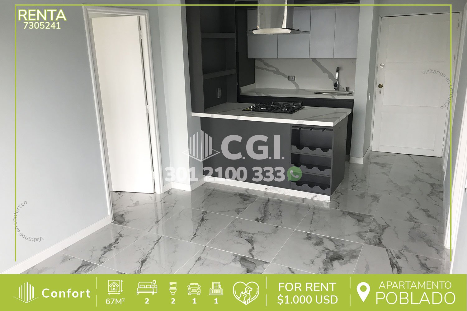 73-05-241 Hermoso y remodelado apartamento disponible para la renta ubicado en el sector de La Visitación en El Poblado, cuenta con un área de 67mt2 distribuidos en sala comedor, cocina integral con buena iluminación y excelentes acabados, zona de ropas, baño social, 2 habitaciónes una con baño privado, 2 closet y parqueadero. Se encuentra ubicado en tranquilo sector con vigilancia las 24/7 y cuenta con salón social junto con zonas verdes, a su alrededor podemos encontrar Mall Zona Dos, Mall La Visitación, y el Centro Comercial El Tesoro, con rutas de acceso por avenida El Poblado, Transversal Inferior y gran variedad de transporte público. CONFORT GESTORES INMOBILIARIOS – Arriendo en Medellín